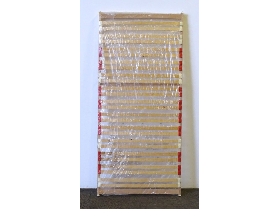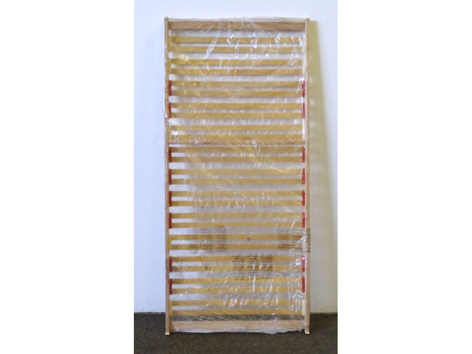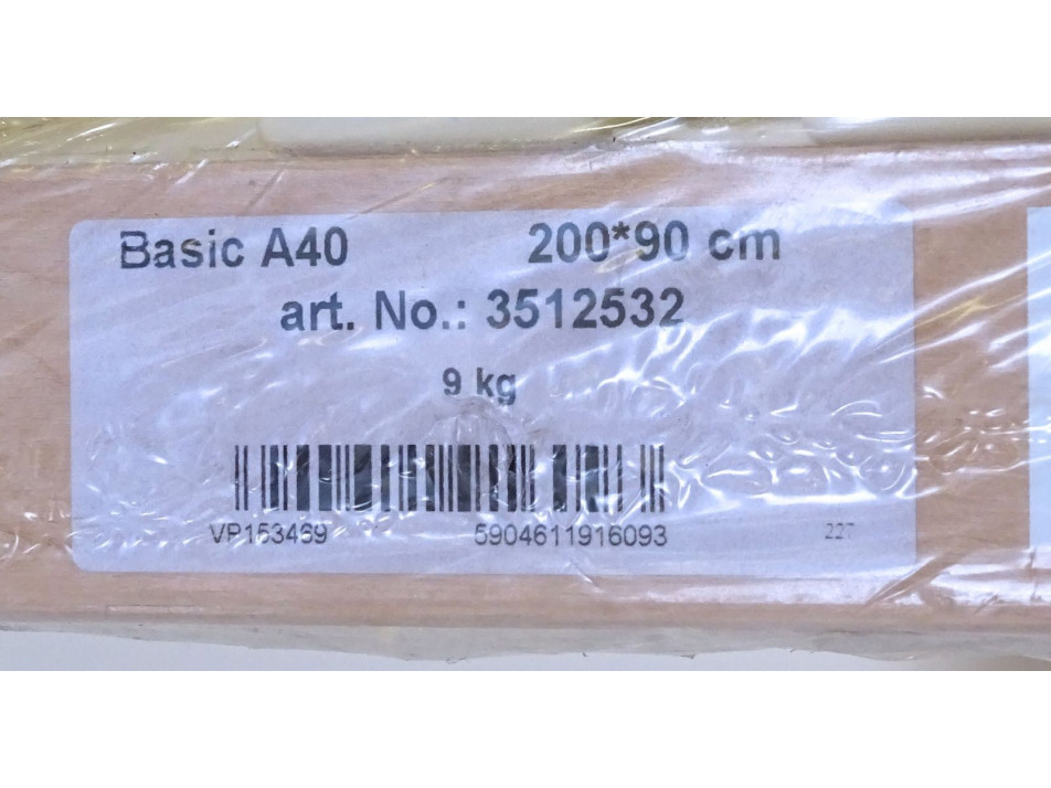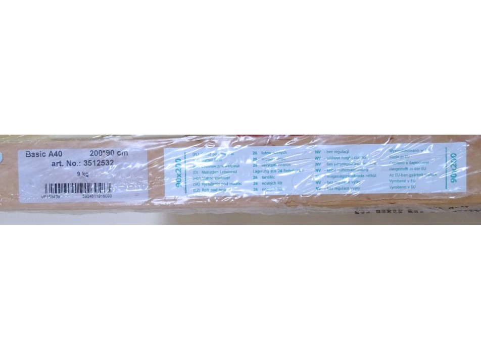 Bontatlan csomagolásában található fix keretes ágyrács, 26 rácsos. Feliratok: BASIC 200x90 CM ART. NO.: 3512532 9 KG