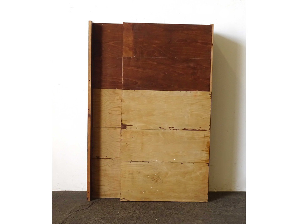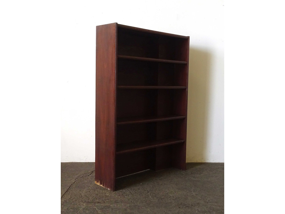 Szép, állapotú, régi, fábol készült könyvespolc, dolgozószoba berendezés. Benne 4 darab fix magasságú polc. A szekrény hátulján egyedi átalakítást végeztek. Egy oszlop, vagy kémény köré illesztkedhetett, így a polcok jobb oldala kisebb mélységű. Lásd fotó.