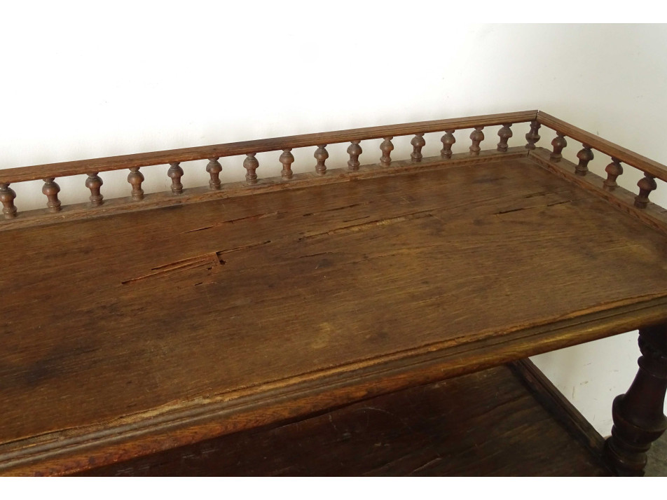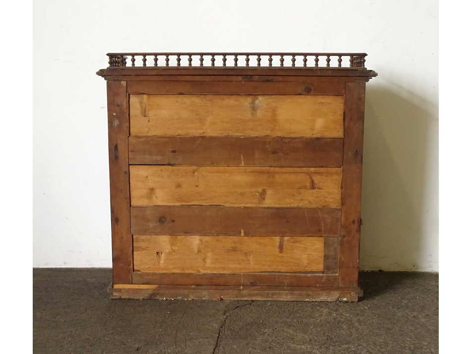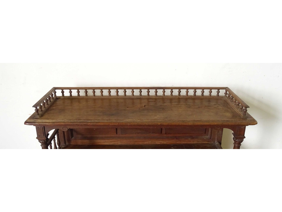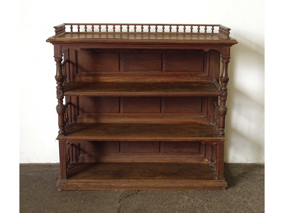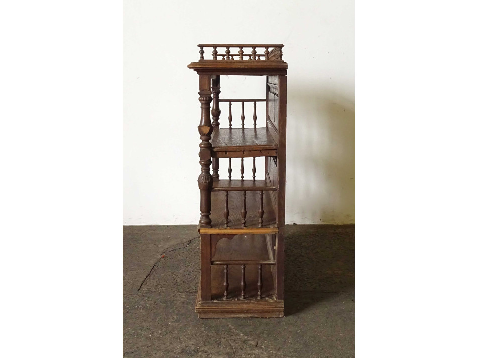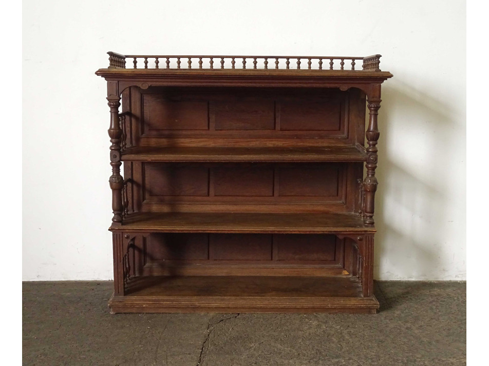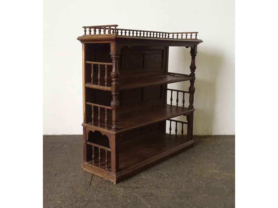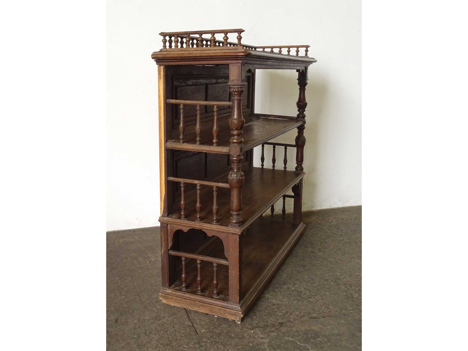 Szép állapotú, négy polccal rendelkező, díszes, faragott oszlopos, rácsos tetejű és oldalú ónémet könyves polc felső rész. A díszek több helyen hiányosak, a felső két polc furnérja sérült, nedvességtől hullámos. A bútor hátulja eredeti, osztott, csapott deszkás.