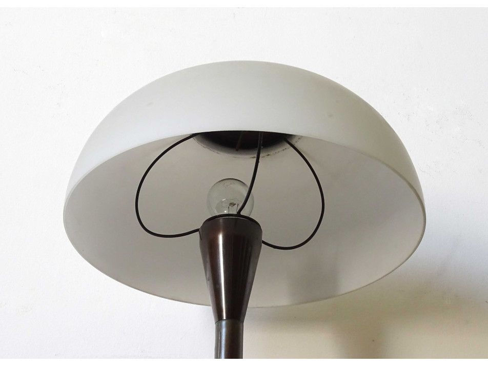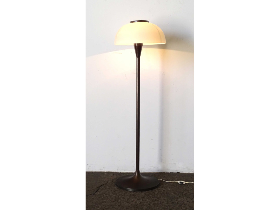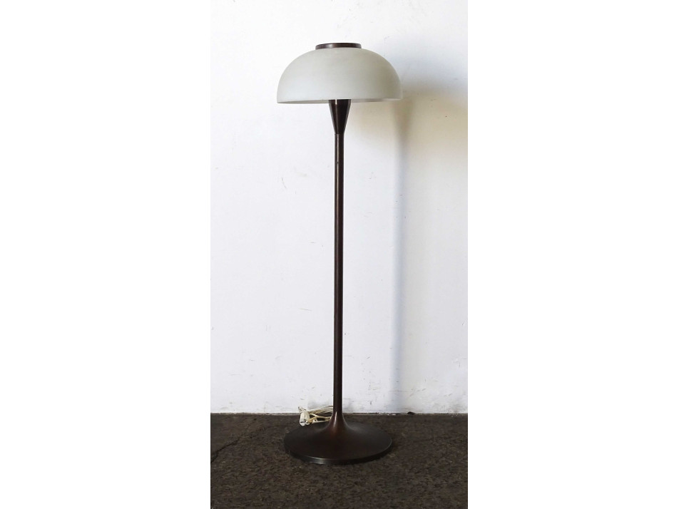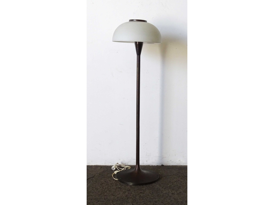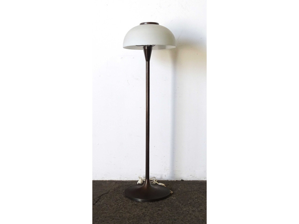 Hibátlan, működő állapotban lévő, formatervezett, bronz színű, fémtestű, space age design állólámpa, olvasólámpa, hangulatvilágítás, hibátlan tejüveg búrával. Nagyméretű (E27) izzó való bele.
