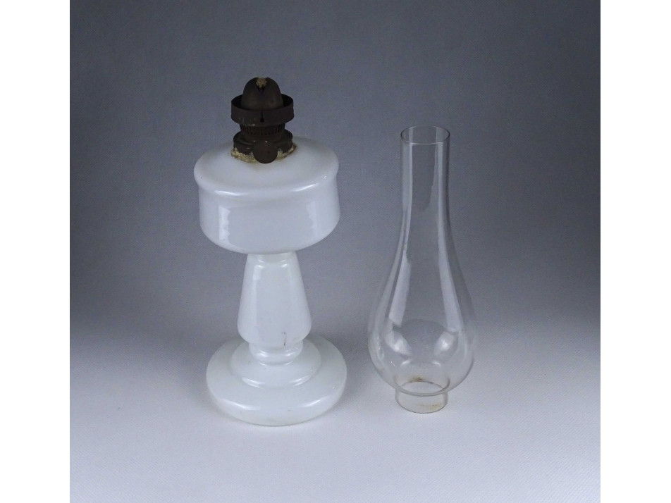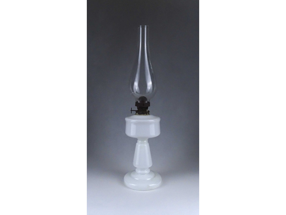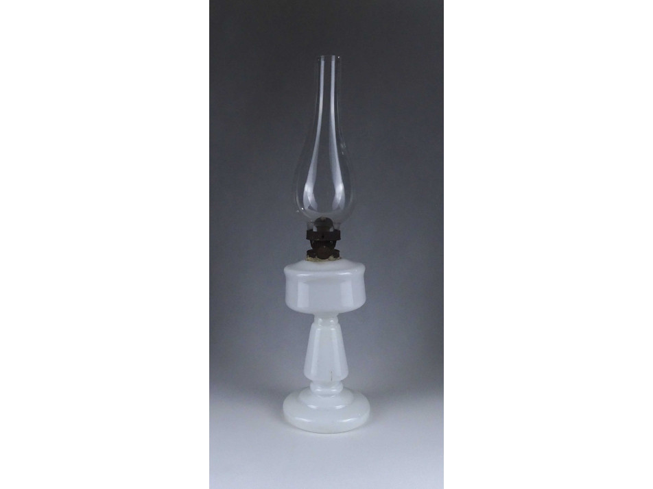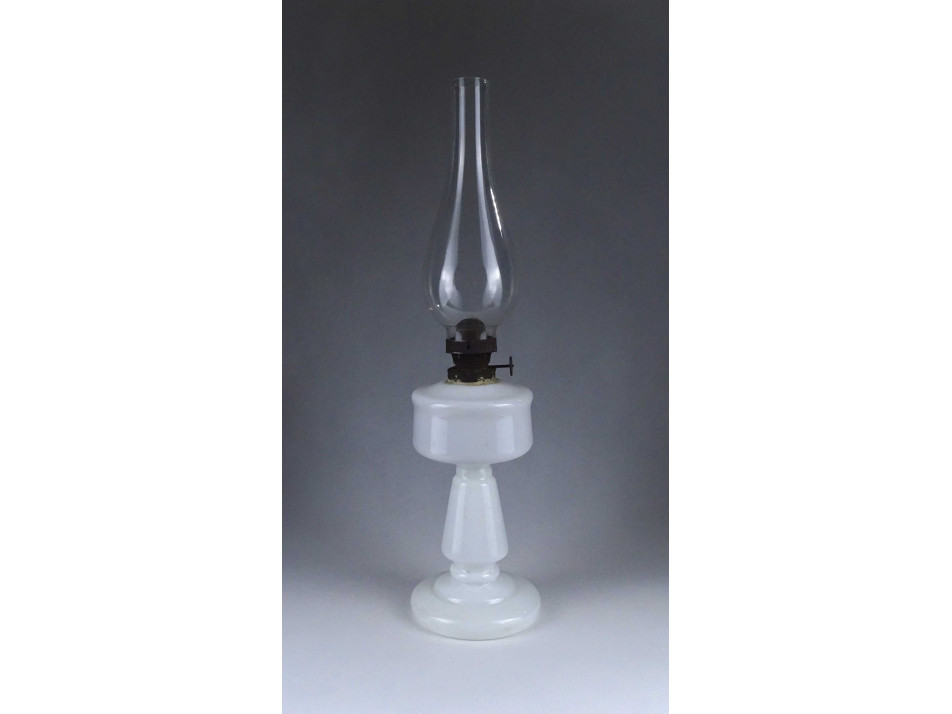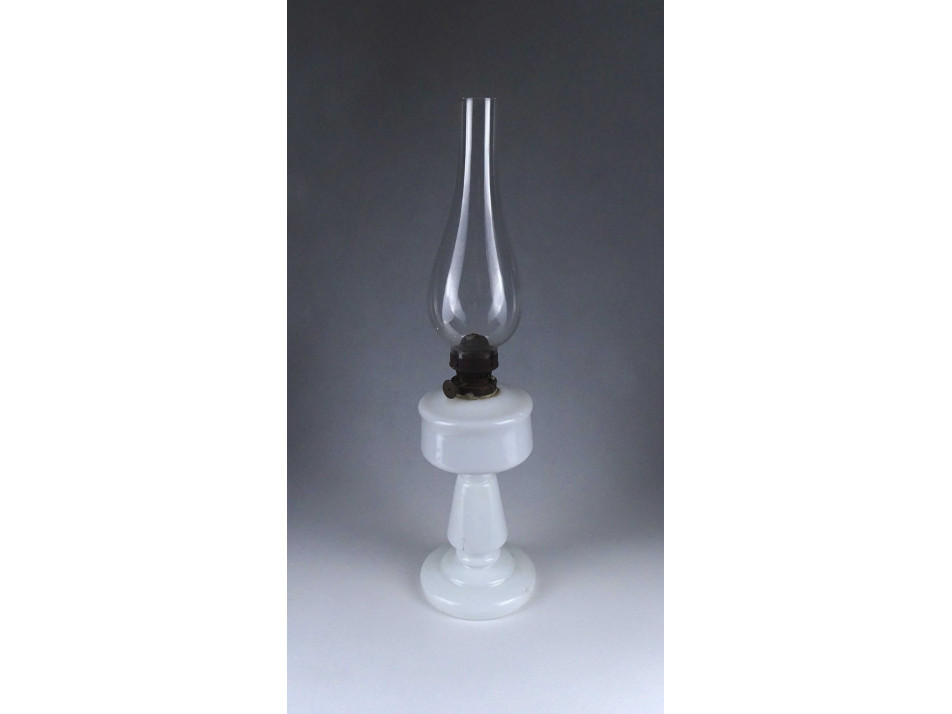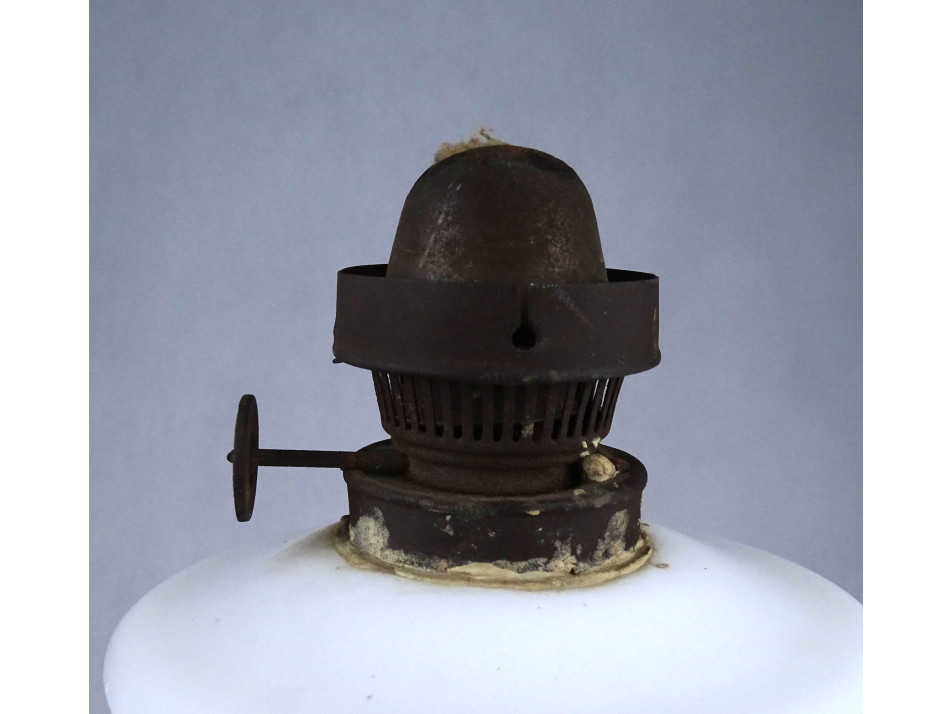 Régi, szép állapotú, tejfehér üveg petróleum lámpa, hibátlan cilinderrel. Az égőszerkezet és a lámpatest csatlakozásánál javítás, ragasztás nyoma látható.