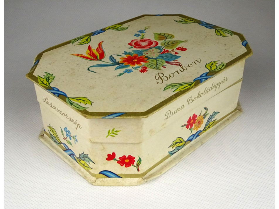 Régi, feliratos, virágdíszes kemény karton díszdoboz, bonbon doboz. Feliratok: SZÁZSZORSZÉP BONBON DUNA CSOKOLÁDÉGYÁR 1986. MÁR. 13.