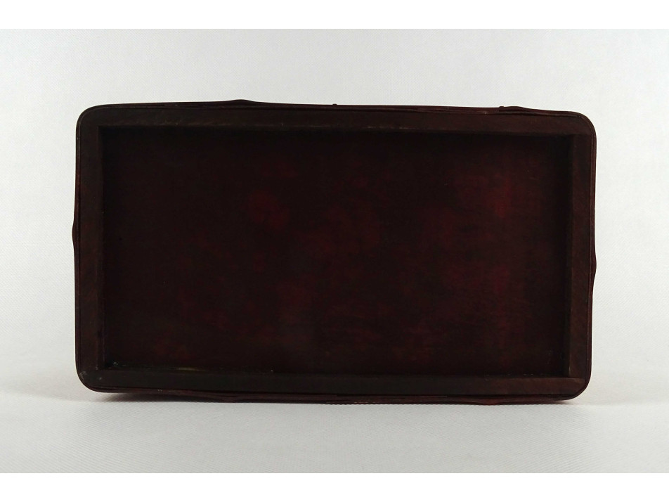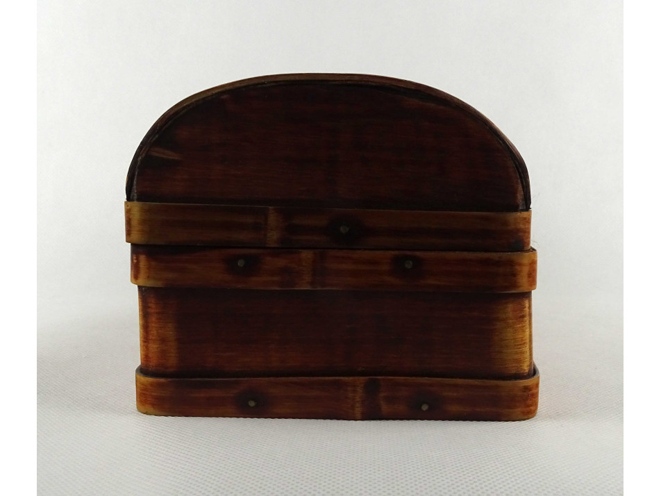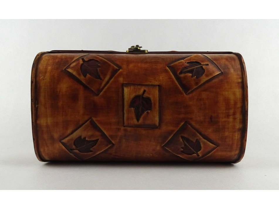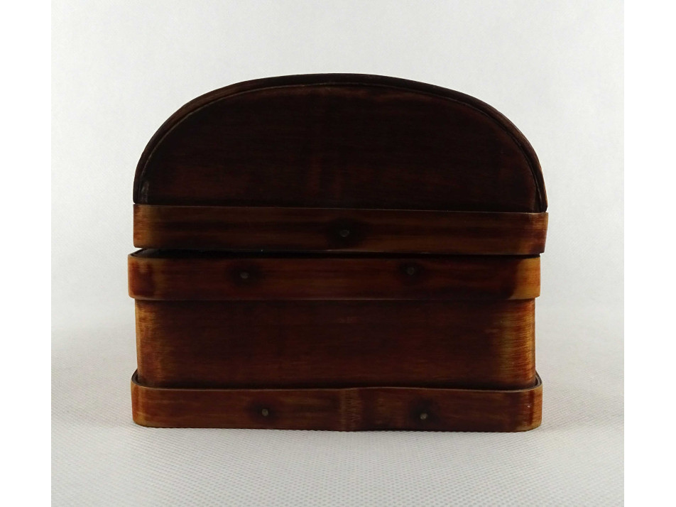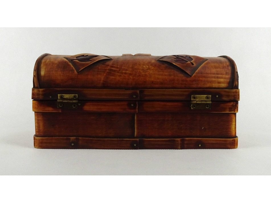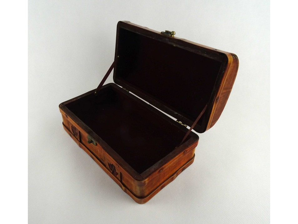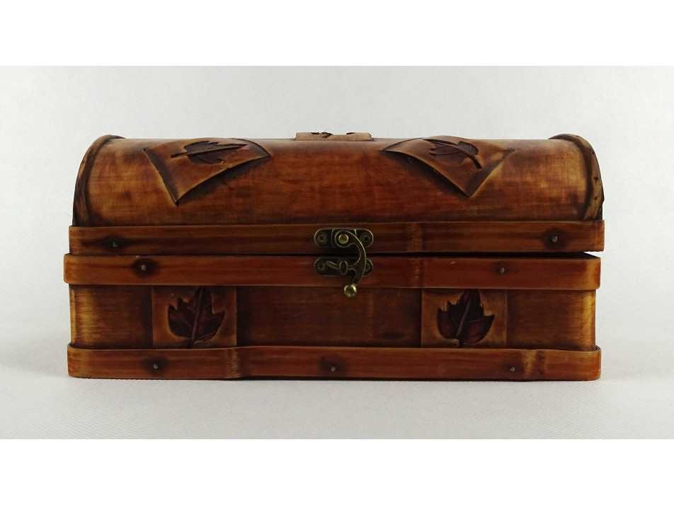 Régi, nagyméretű, ívelt tetejű, vékonyfalú, fa furnérból készült, levél mintákkal díszített, belül bordó bársonnyal bélelt, egyszerű zárral rendelkező fadoboz, díszdoboz, kincses ládikó.