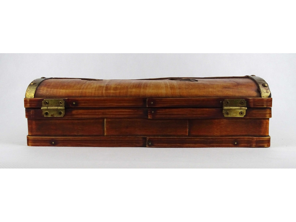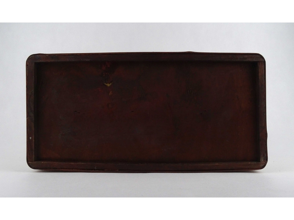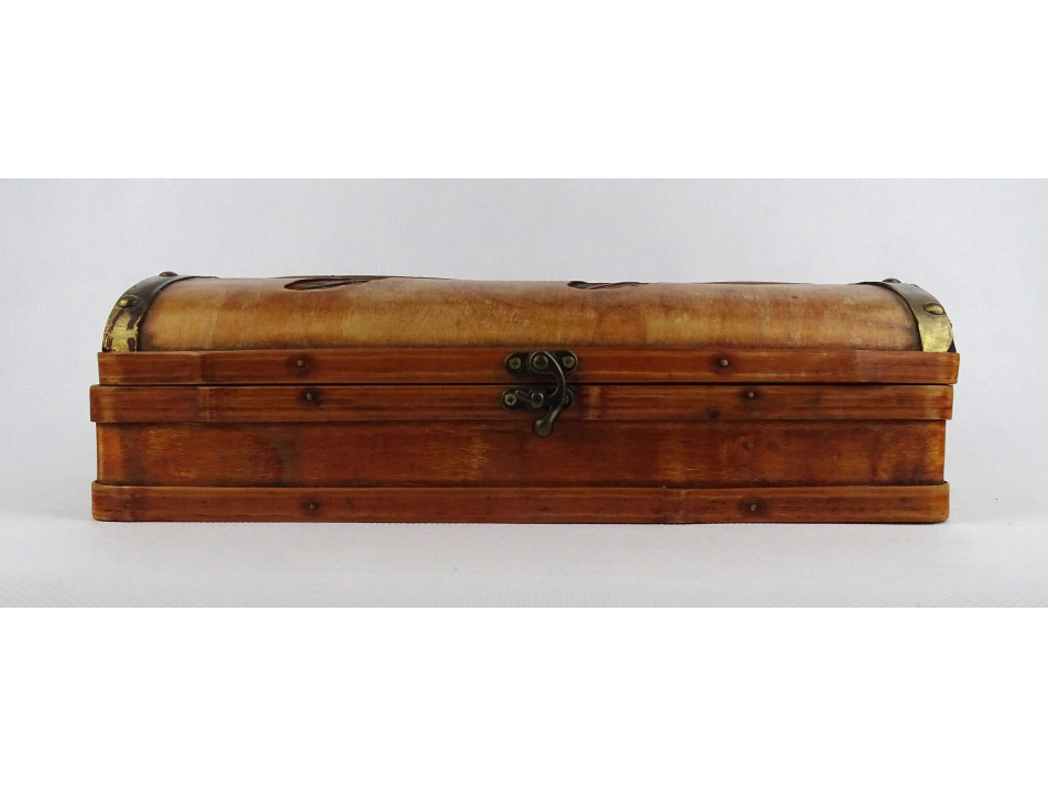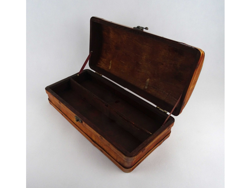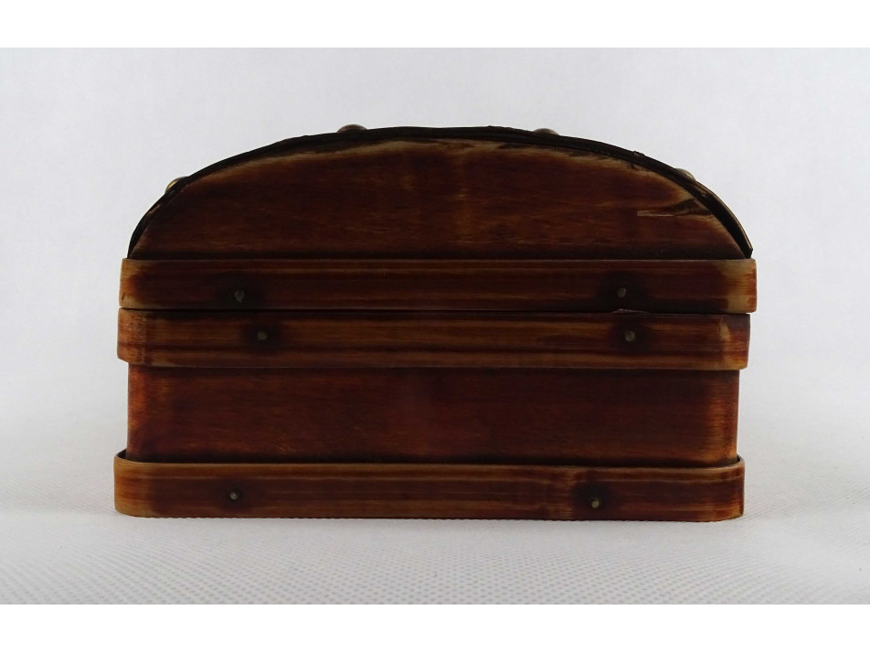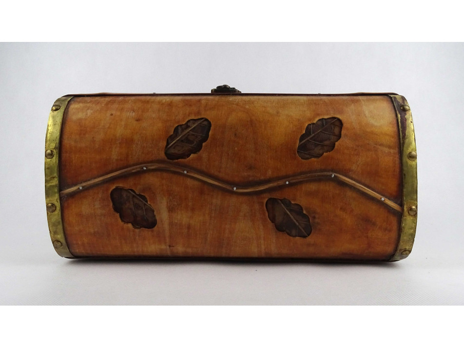 Régi, nagyméretű, ívelt tetejű, vékonyfalú, fa furnérból készült, levél mintákkal díszített, belül két részre osztott, egyszerű zárral rendelkező fadoboz, díszdoboz, kincses ládikó.