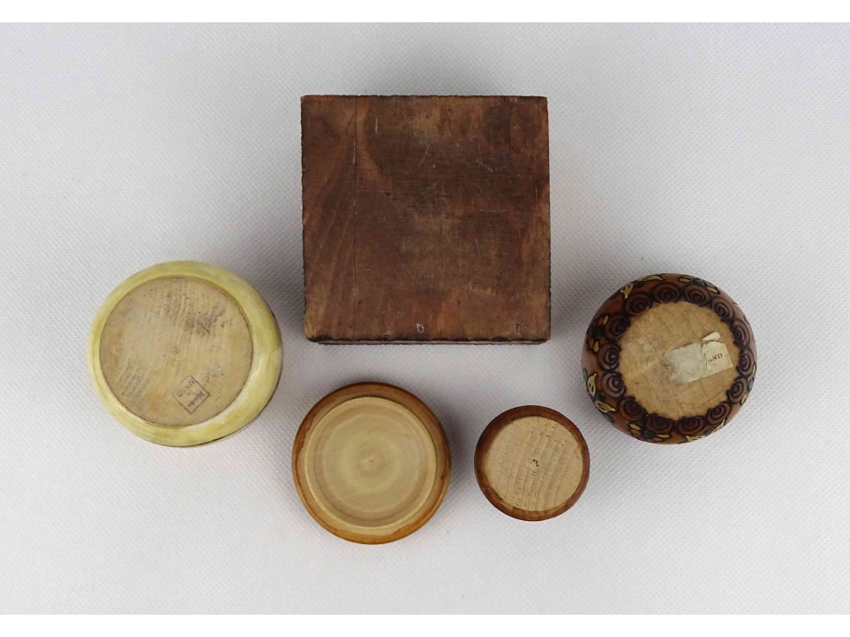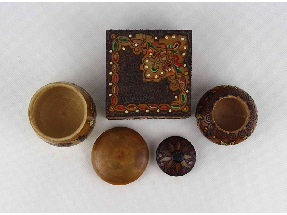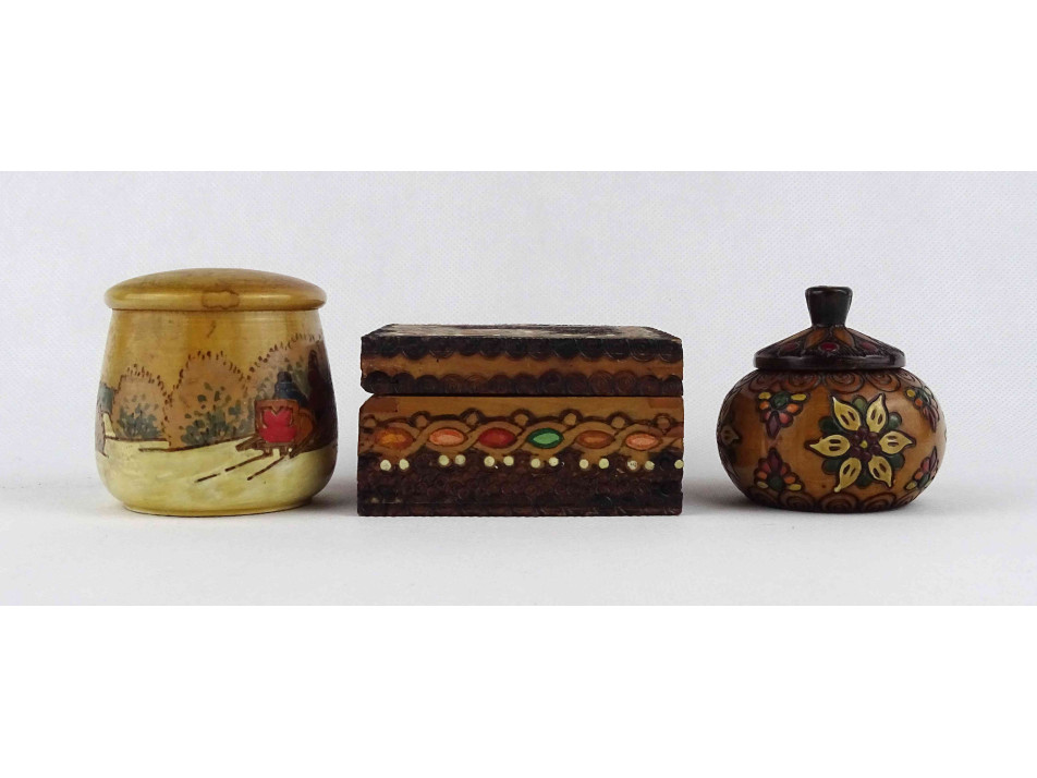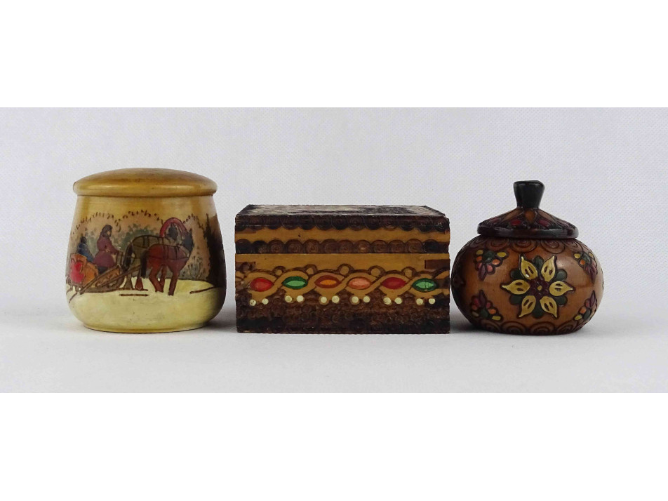 Régi, hibátlan állapotú égetett és kézi festéssel díszített, fa dobozok. Kettőn virág motívumoka harmadikon téli szánas, trojkás jelenet látható. Varrósdoboz, kártyadoboz, ékszertartó fadoboz.
