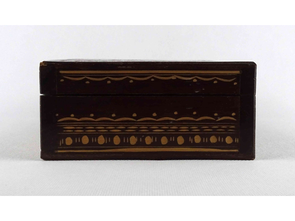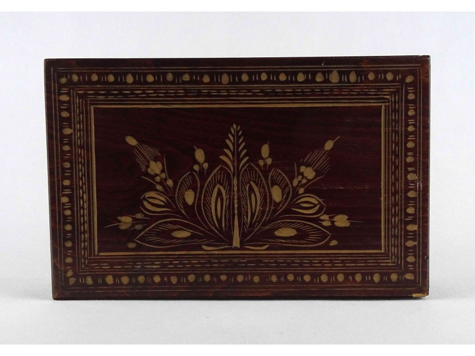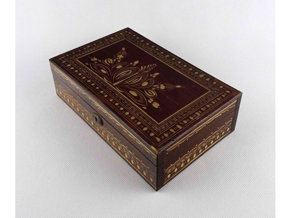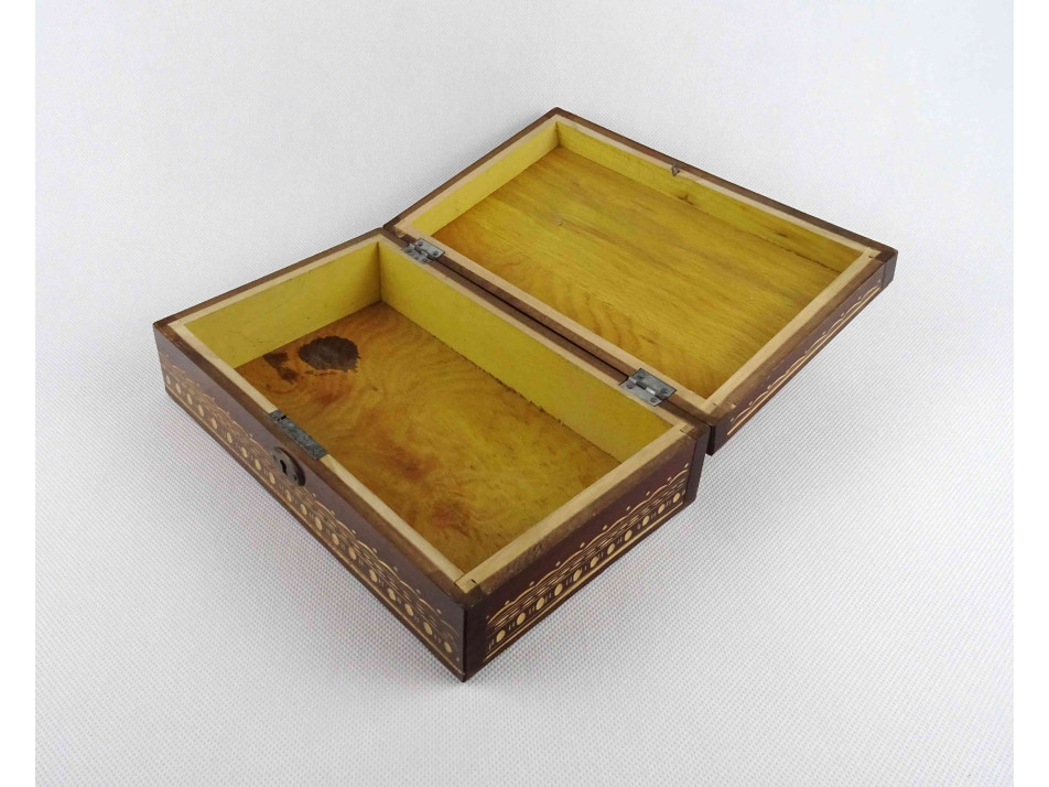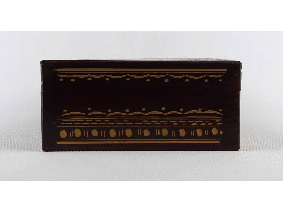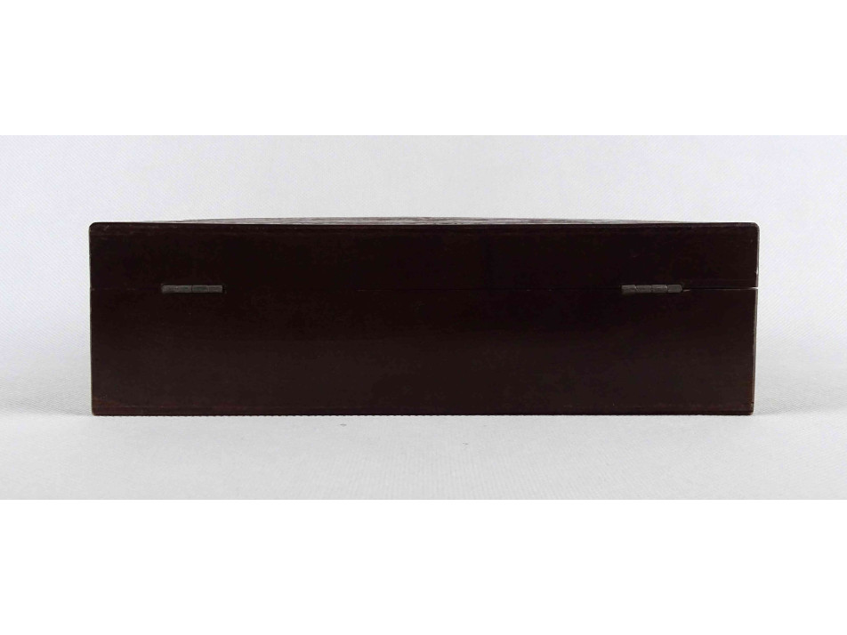 Szép állapotú, faragott, vésett díszítéses, zárral rendelkező fedeles kártyadoboz, fa doboz, kártya doboz vagy cigarettás doboz. A kulcs sajnos nincs meg hozzá.
