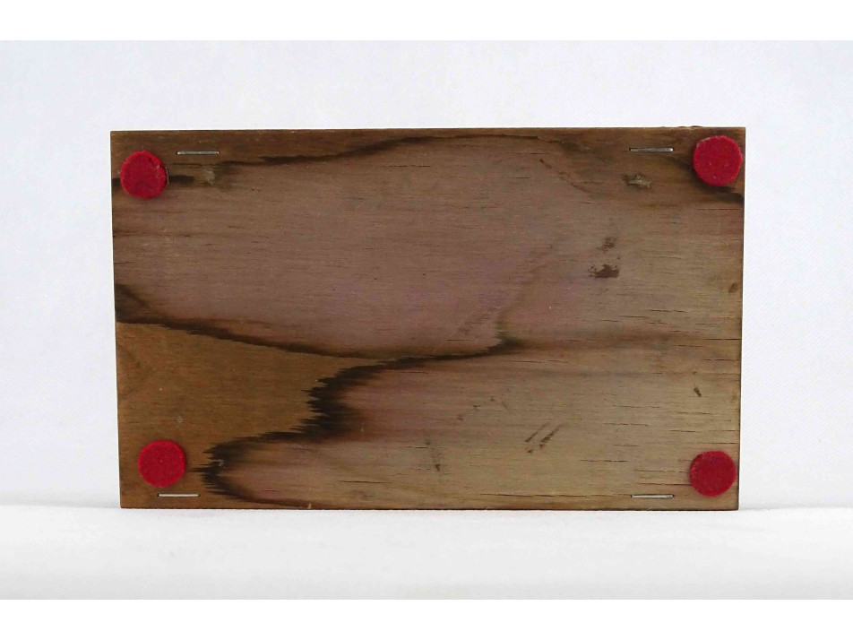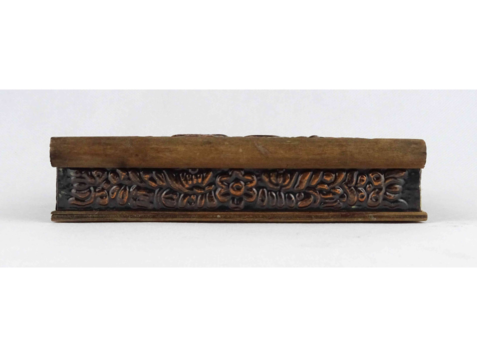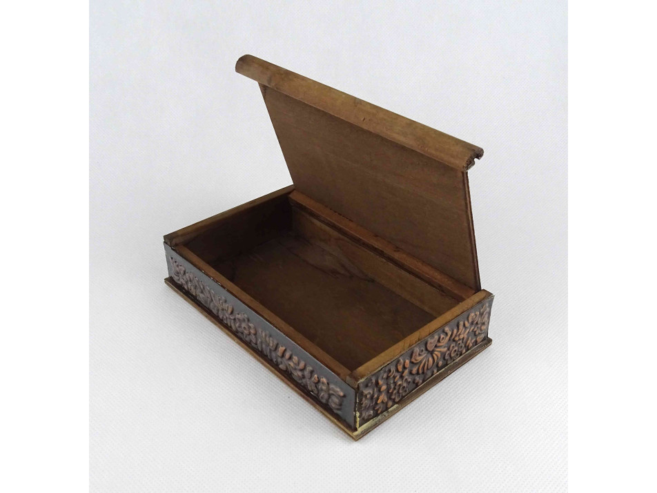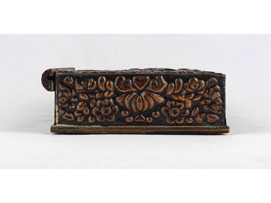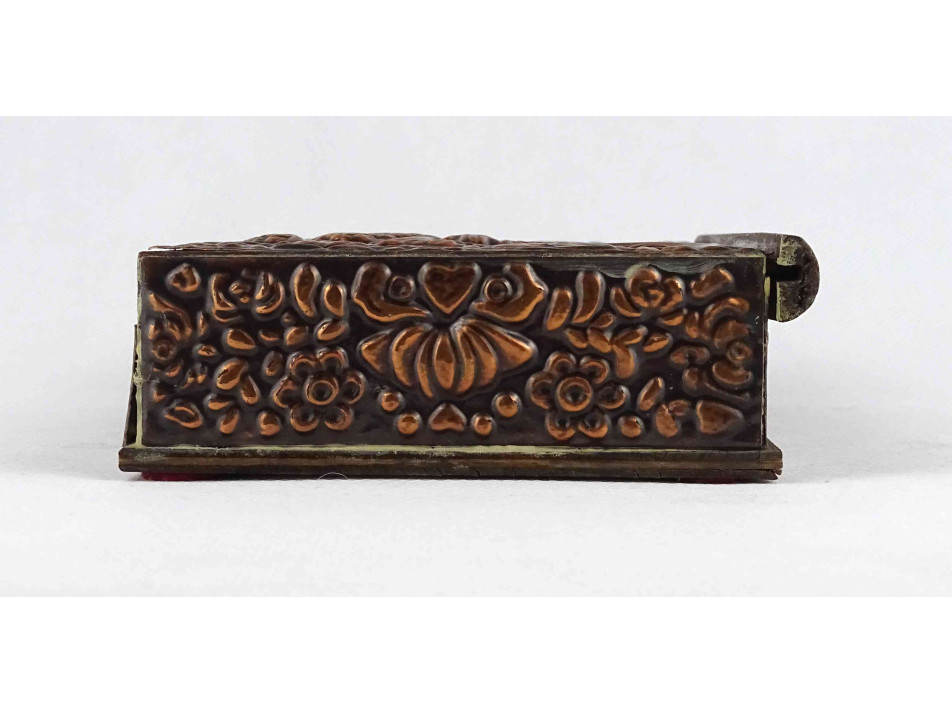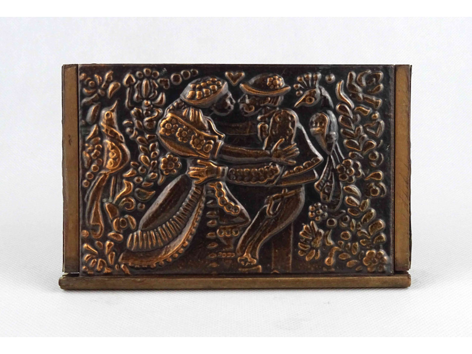 Régi, szép állapotú, plasztikus népi mintákkal és táncoló szerelmespárral díszített, domborított rézlemezekkel borított fadoboz, kártyadoboz vagy cigaretta kínáló doboz.