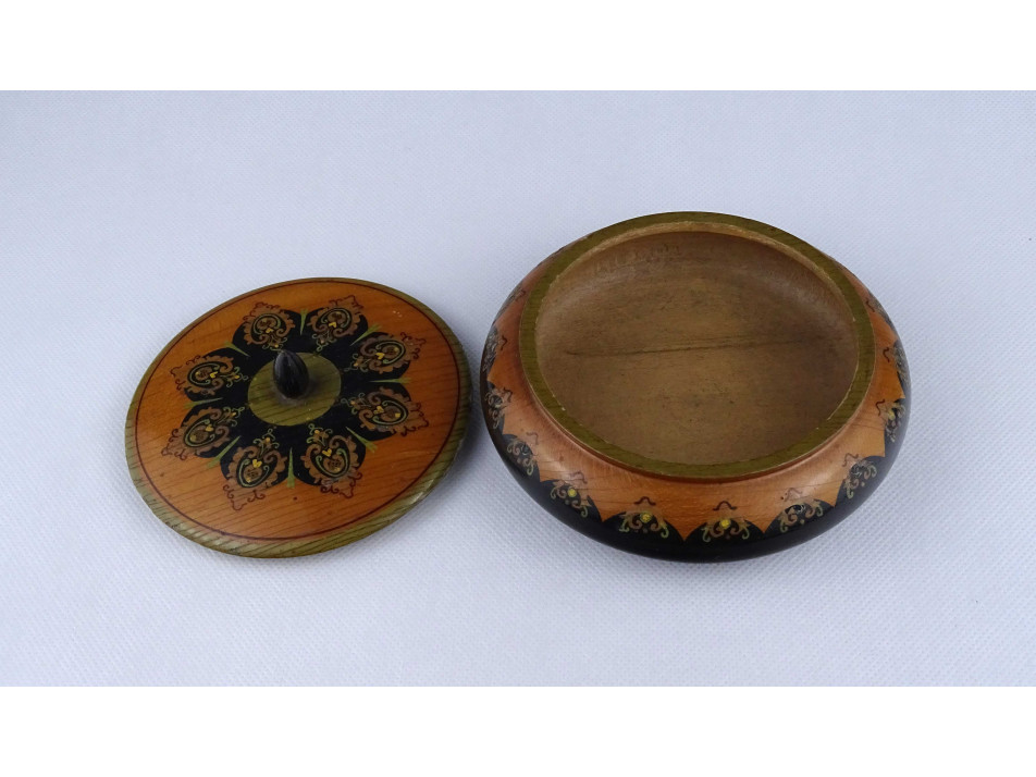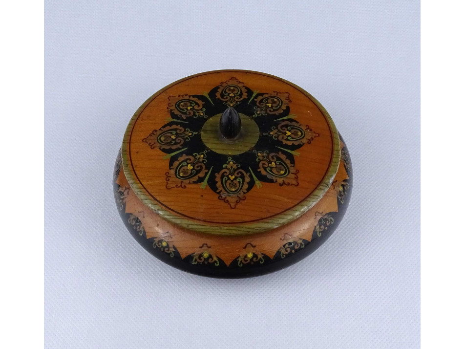 Régi köralakú festett virágmintás fadoboz 13.5 cm