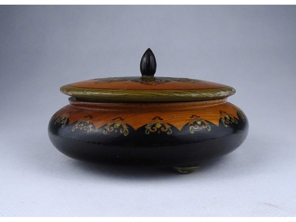 Régi, szép állapotú, nagyméretű, három lábon álló, festett stilizált virágmintával díszített köralakú fa doboz, fa bonbonier. Fedele belső felén festett madáralak benne felirat: ISTVÁN. A doboz felületén a lakk és a festék több helyen sérült, lepattogzott.