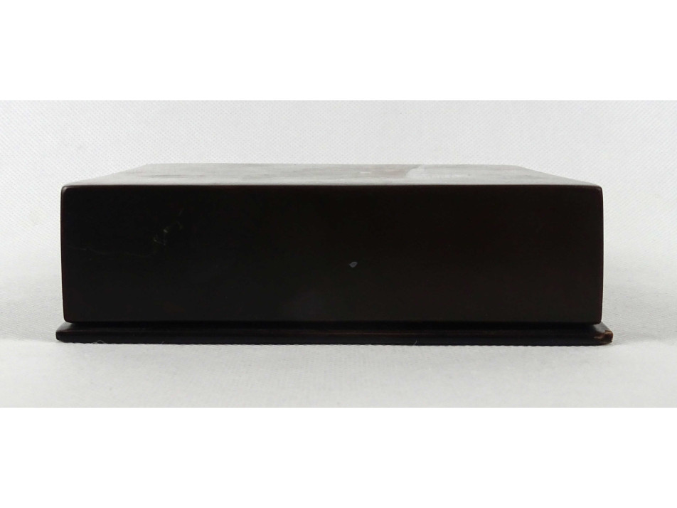 Szép állapotú, kívül fekete, belül piros színű, lakkozott fa ékszertartó doboz. Tetején színes, festett keleti tengerparti látkép díszítés.