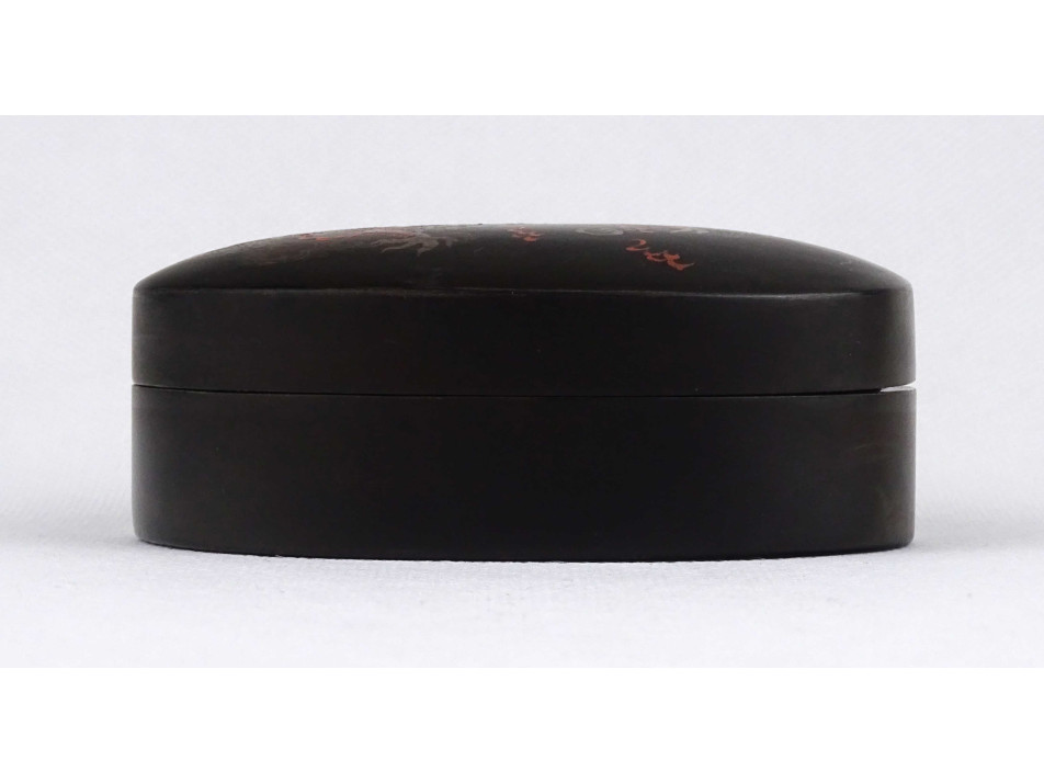 Régi, kínai, távol-keleti, ovális lakkdoboz, ékszertartó doboz kézi festésű sárkány díszítéssel.