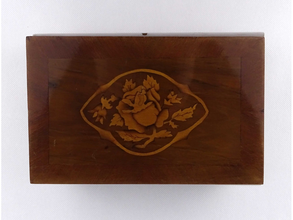 Régi rózsa intarziás kártyadoboz szivartartó fadoboz 24 x 16 x 10.2 cm