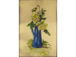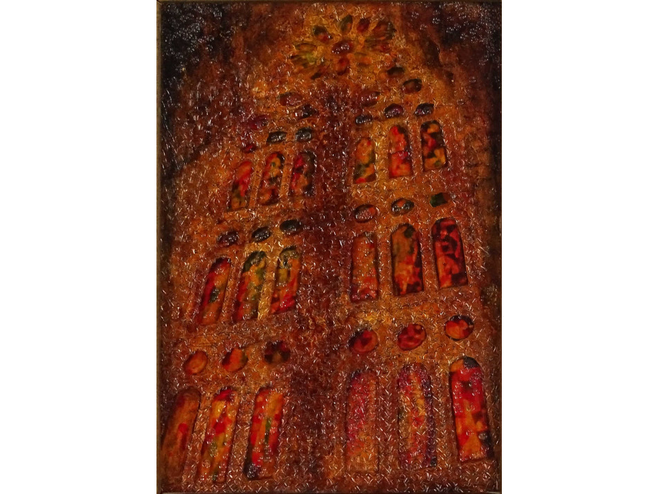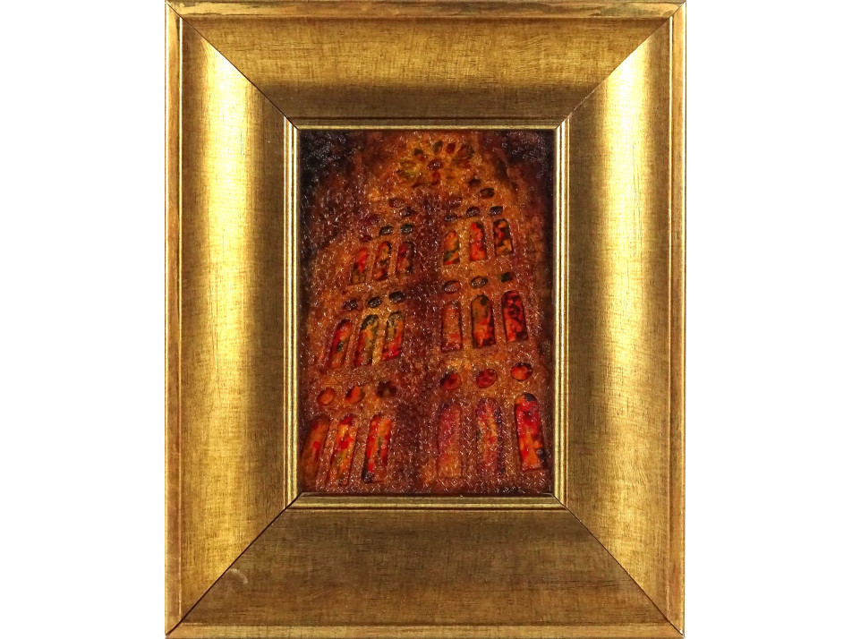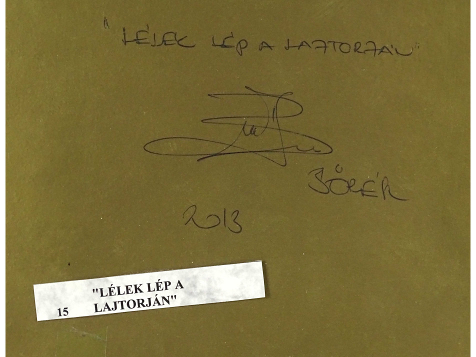 Jelzett, bőrlapra nyomott és festett művészi kép, széles arany színű fakeretben. Hátoldalán kézírással írva a műtárgy címe és a művész szignója látható. Lásd fotó.