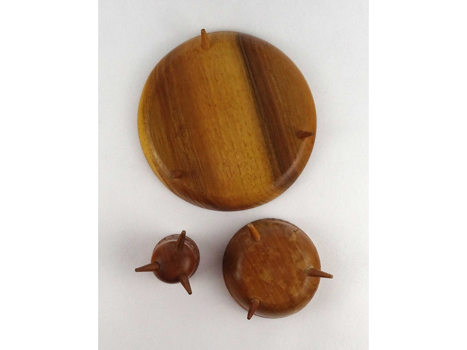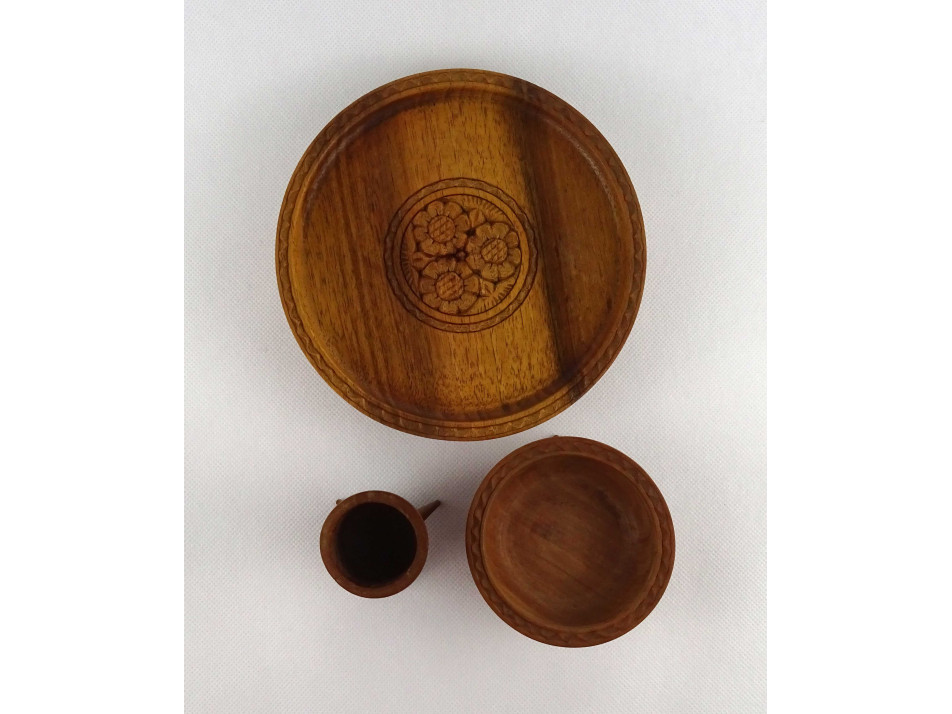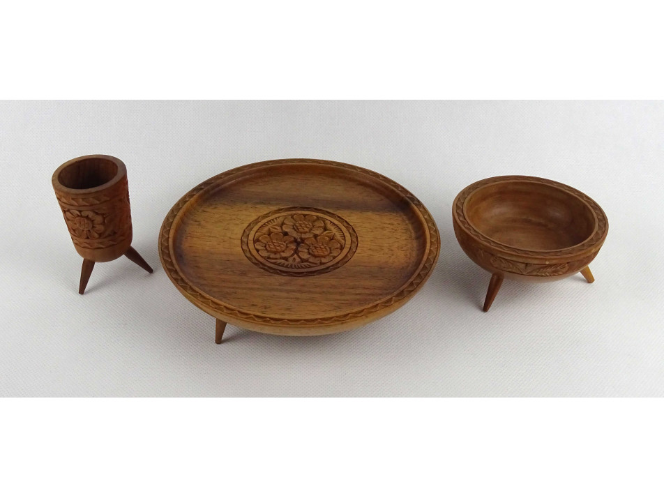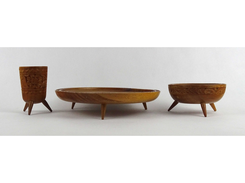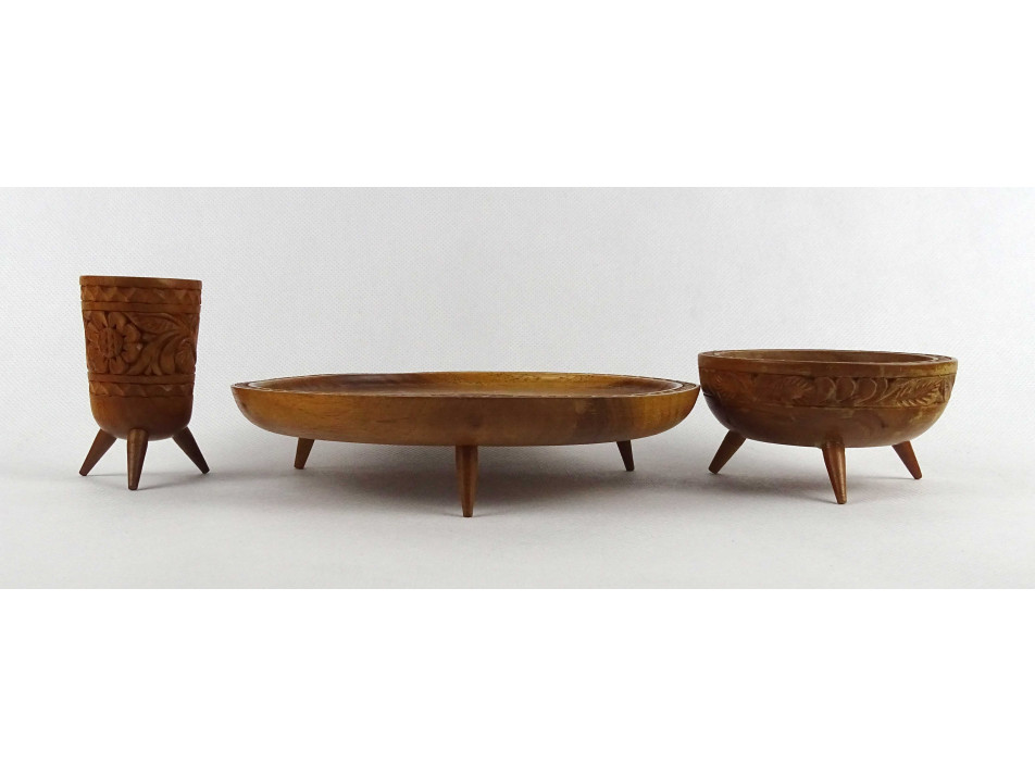 Régi faragott, vésett virágos díszítésű, három lábon álló tál, tányér, fatál készlet, három darab egyben.