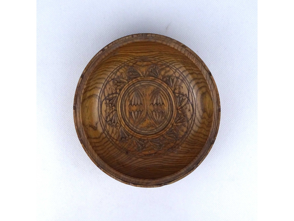 Régi faragott virág motívumos öblös fa kistál 16.5 cm