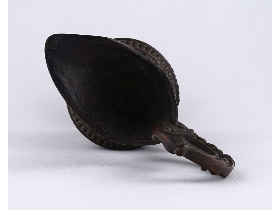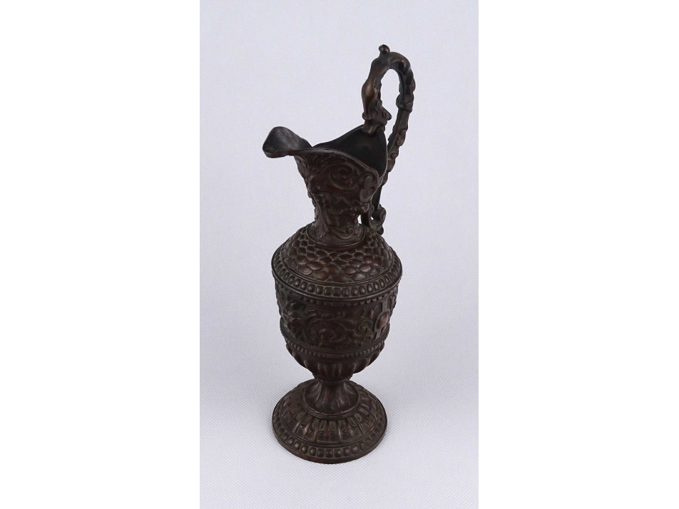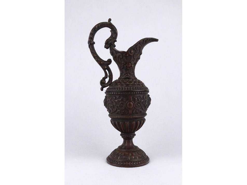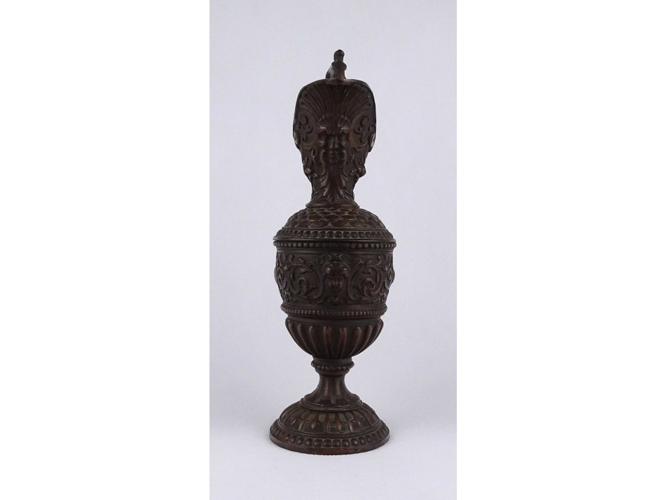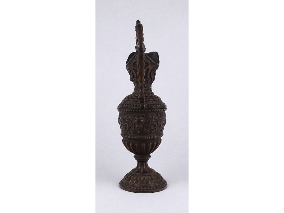 Régi, antik görög vagy római stílusú faunfejes bronz karaffa, díszkancsó, dísztárgy.
