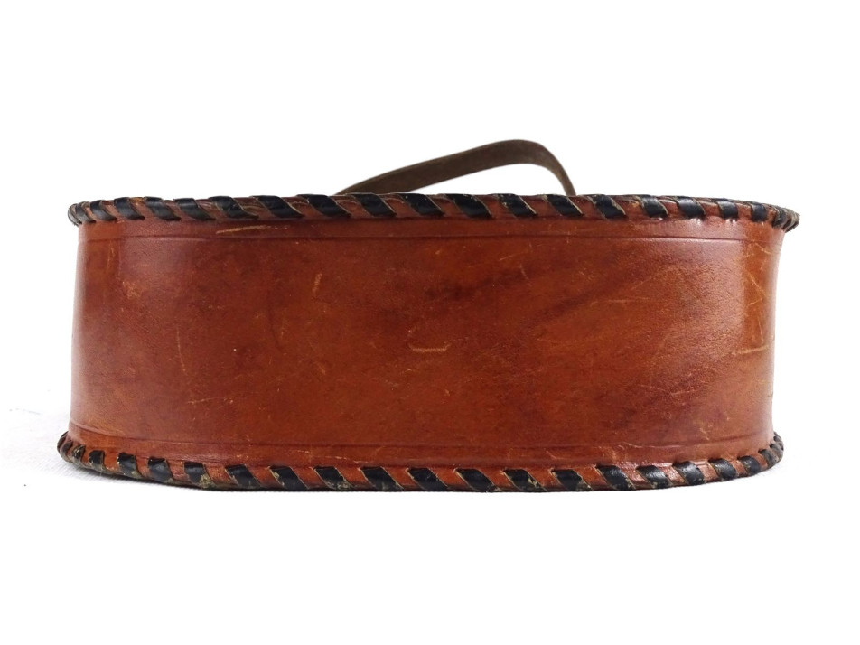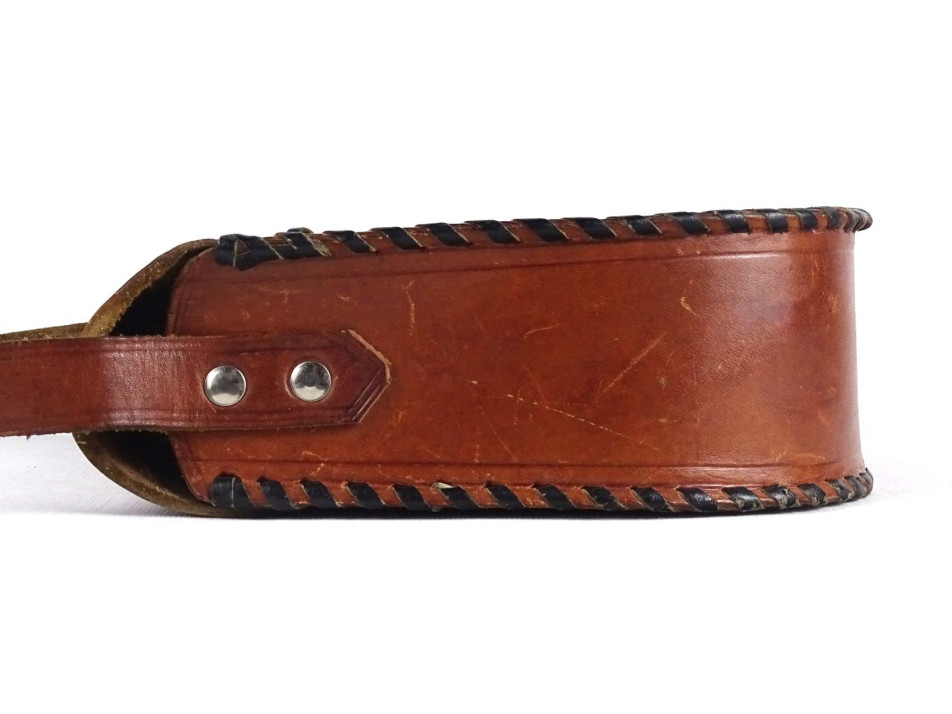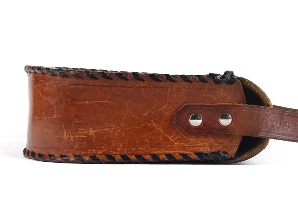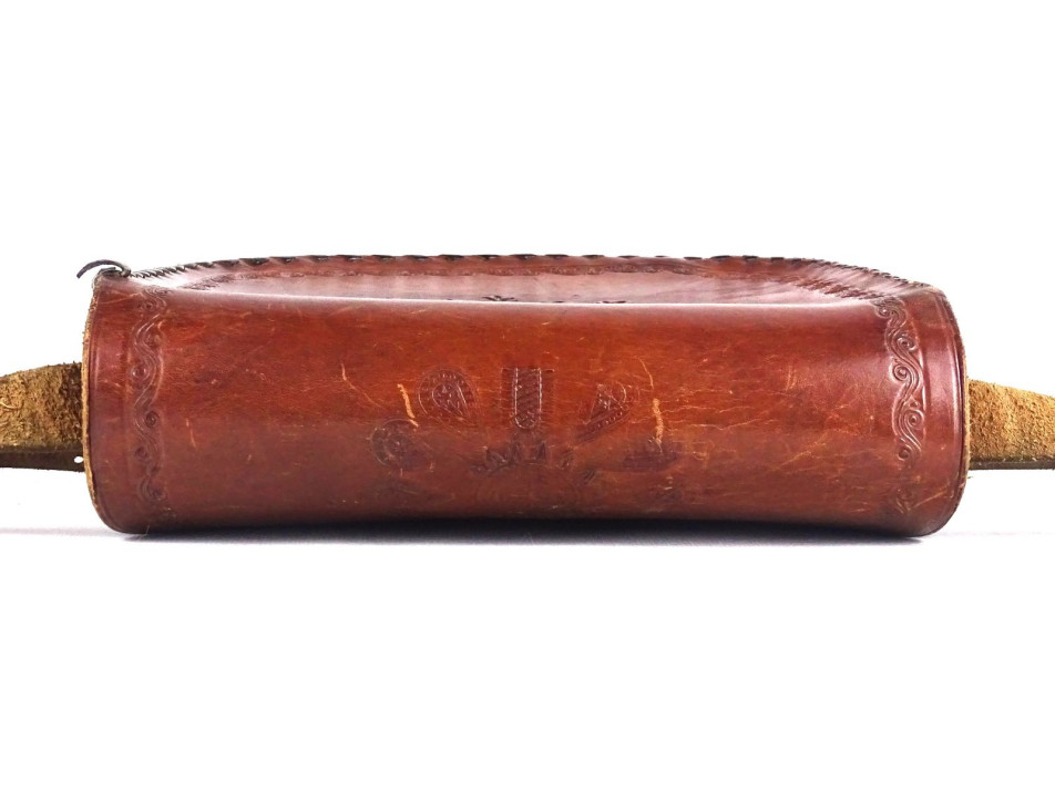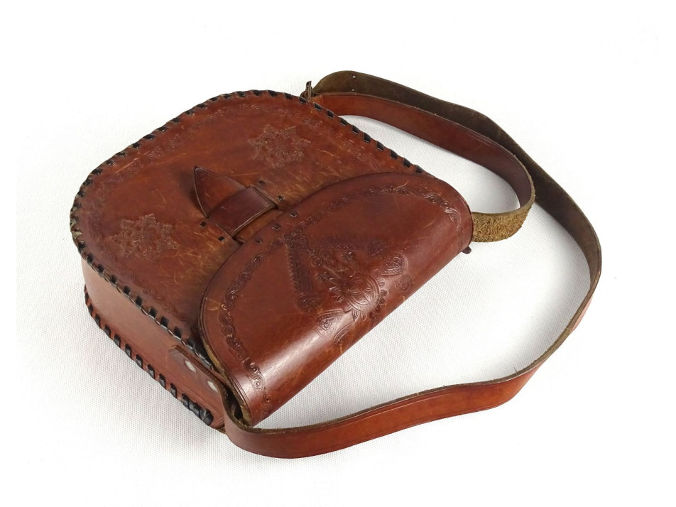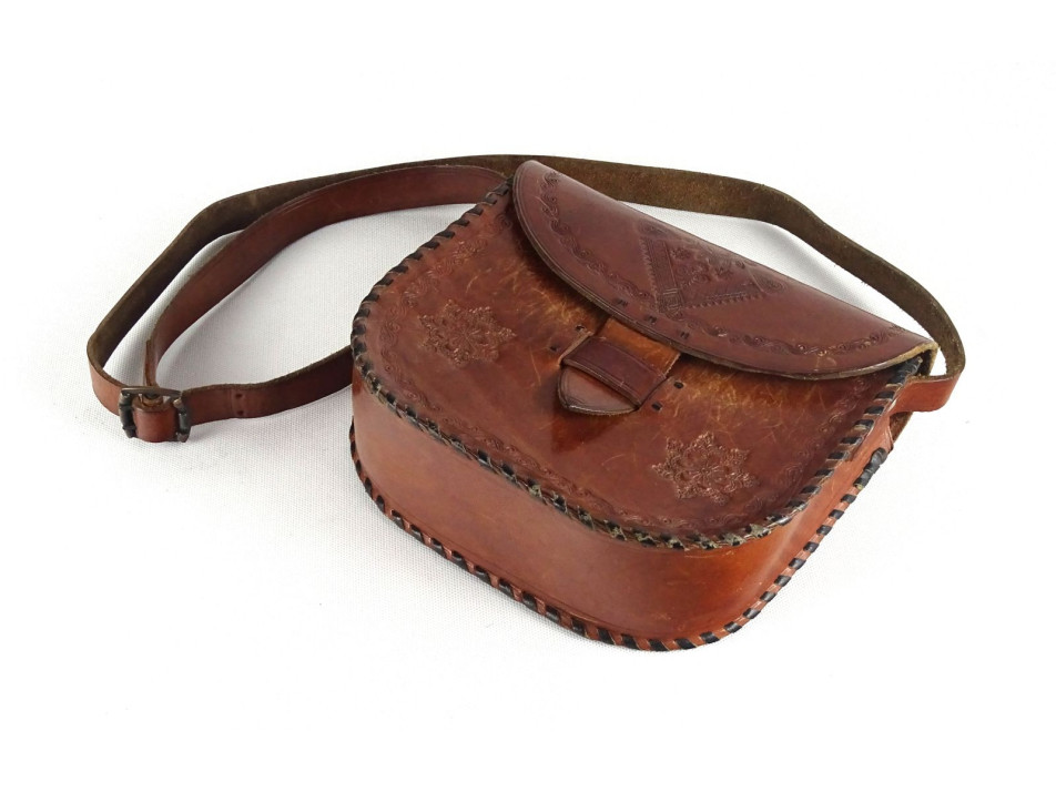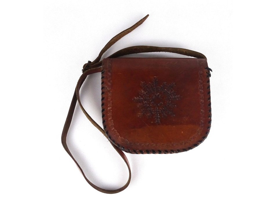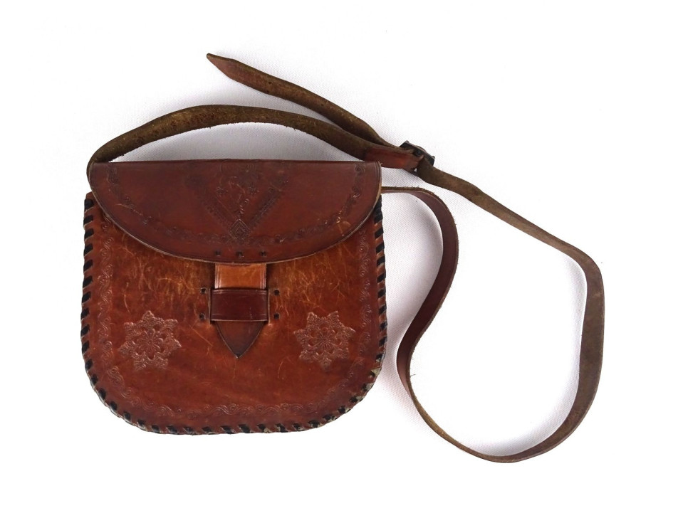 Szép állapotú, használt, barna színű valódi bőr válltáska. Női táska. A bőr felülete nyomott mintákkal díszített.