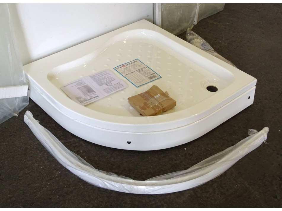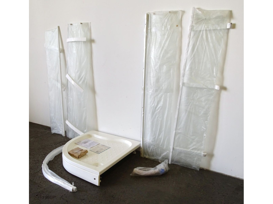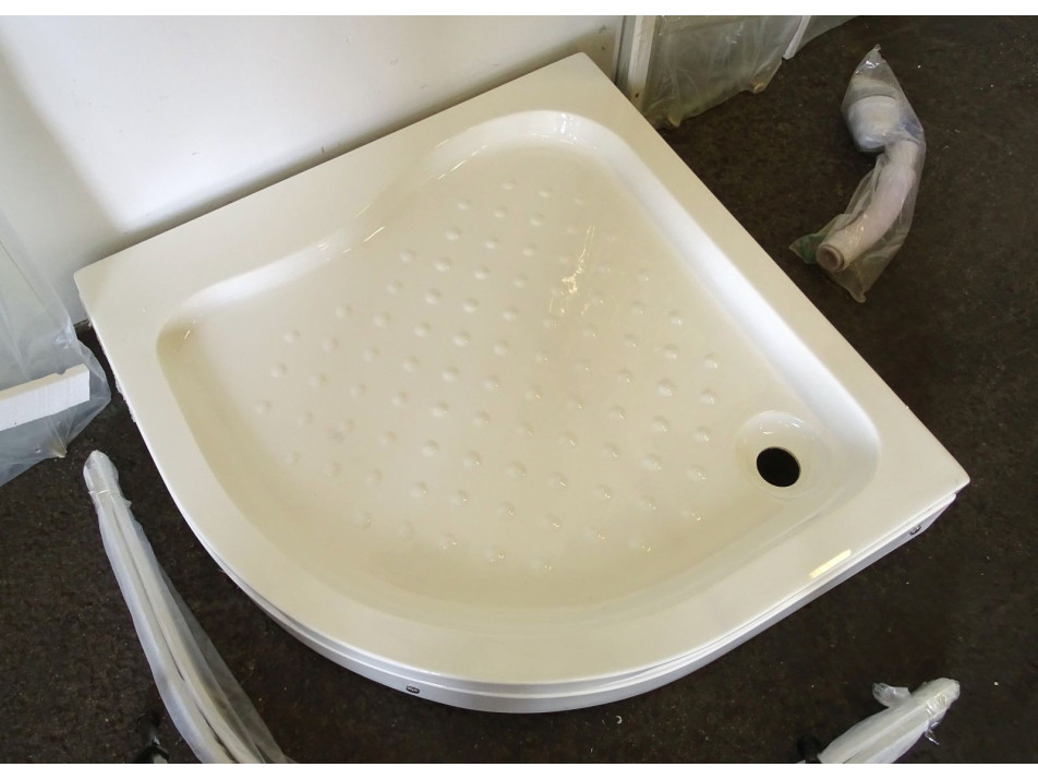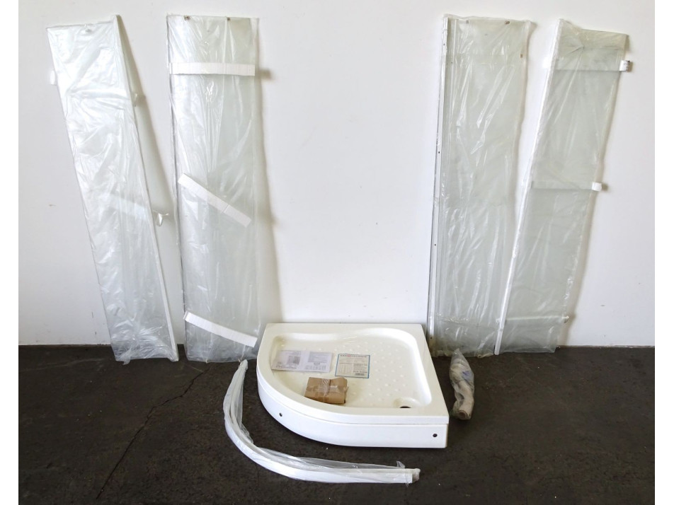 Használatlan, beépítetlen zuhanyfülke. 90 x 90 cm-es zuhanytálca, íves zuhanykabin. Komplett szett, lefolyóval, útmutatóval a beszereléshez.