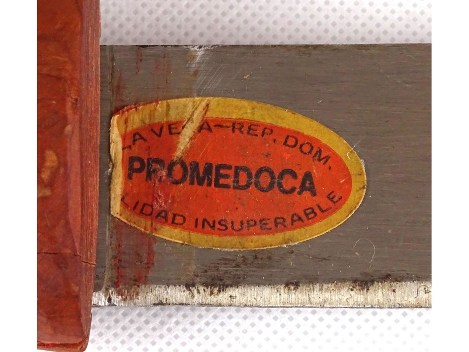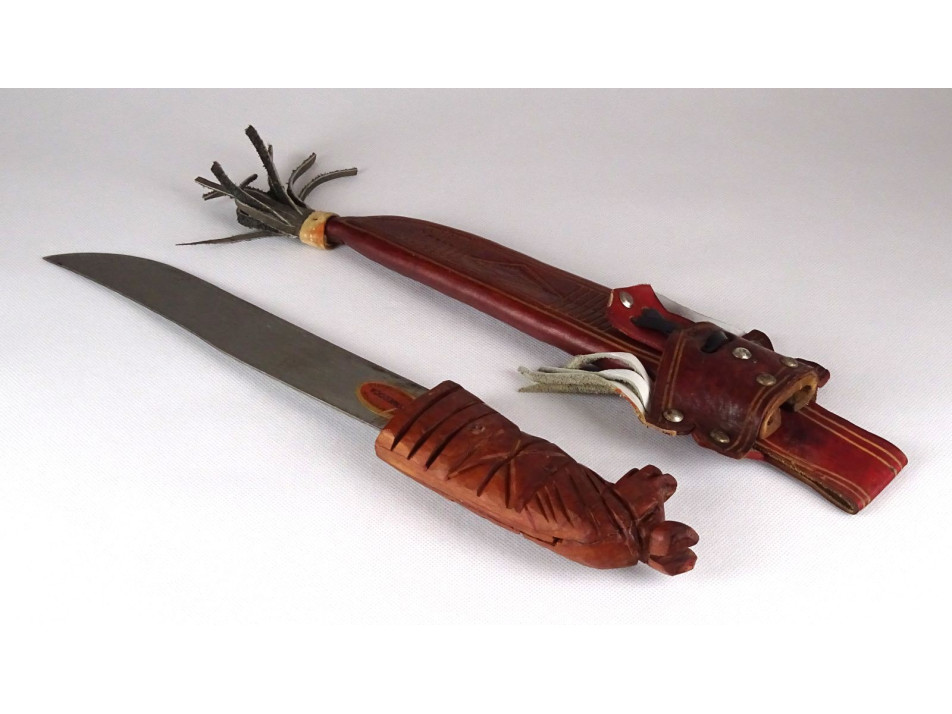 Díszes bőr tokjában található, jelzett dominikai acélpengés macséta, bozótvágó kés. Díszes, övre fűzhető börtokban, faragott lófejes markolattal. Nem használati tárgy. Dísztárgy!