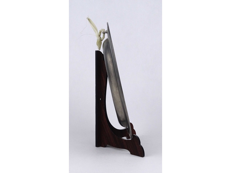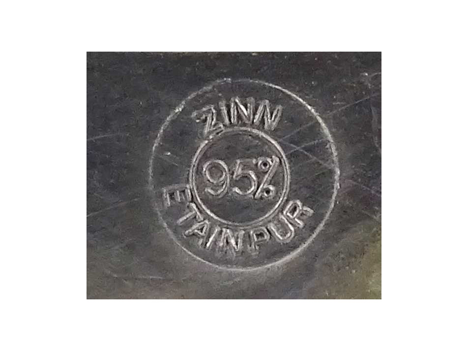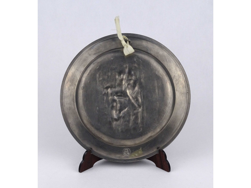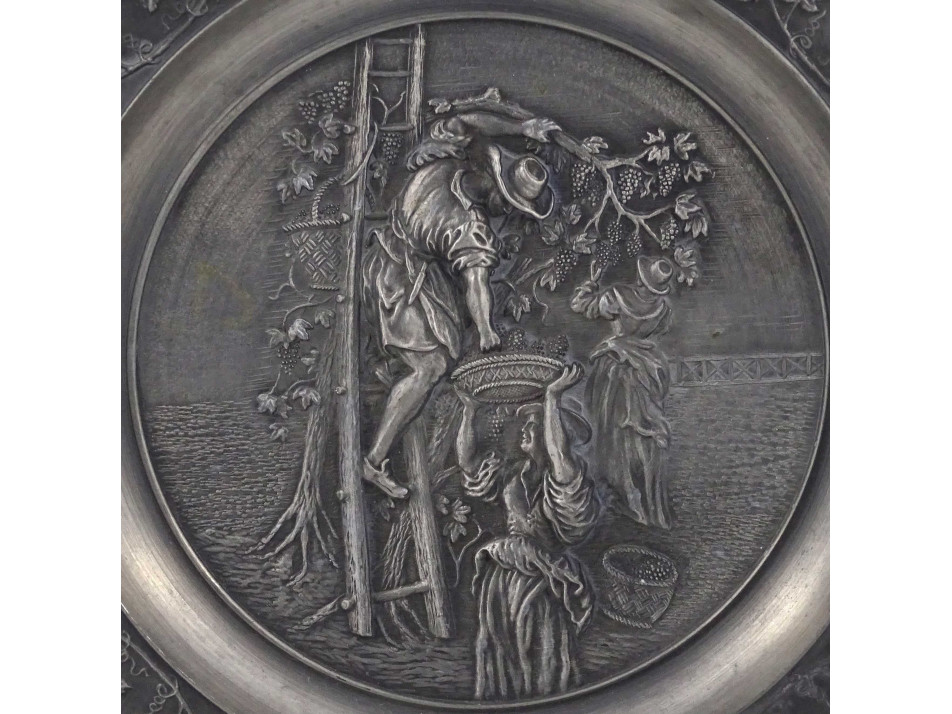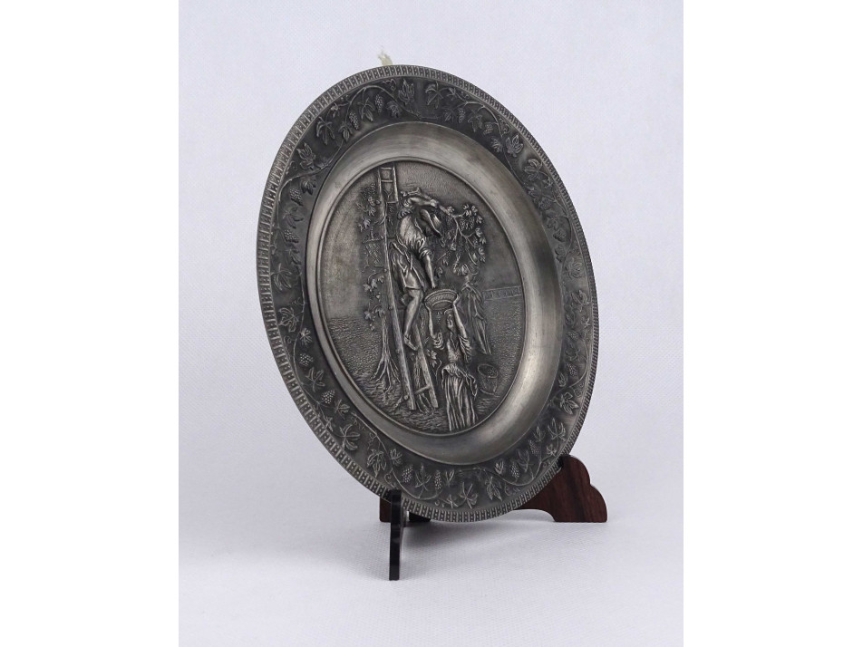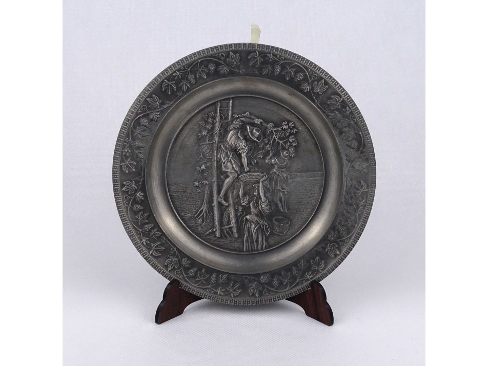 Hibátlan állapotú, ón tányér, fali dísztányér, rajta plasztikus szőlő leveles díszítés középen szüreti jelenettel. Akasztási lehetőséggel rendelkezik.