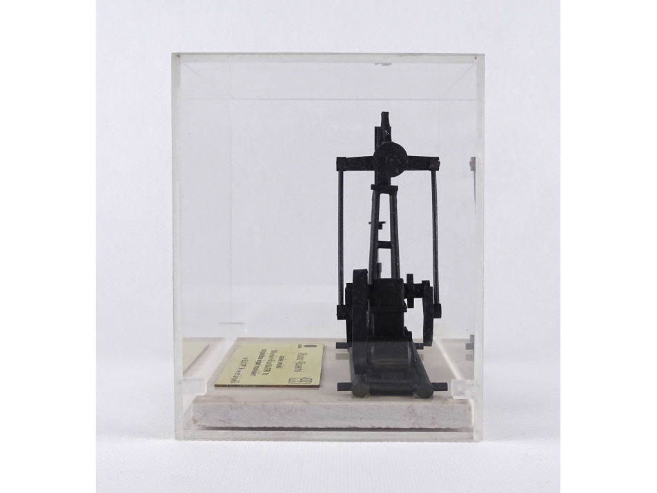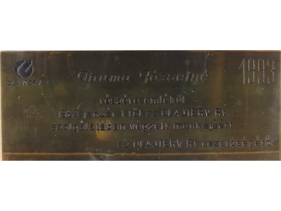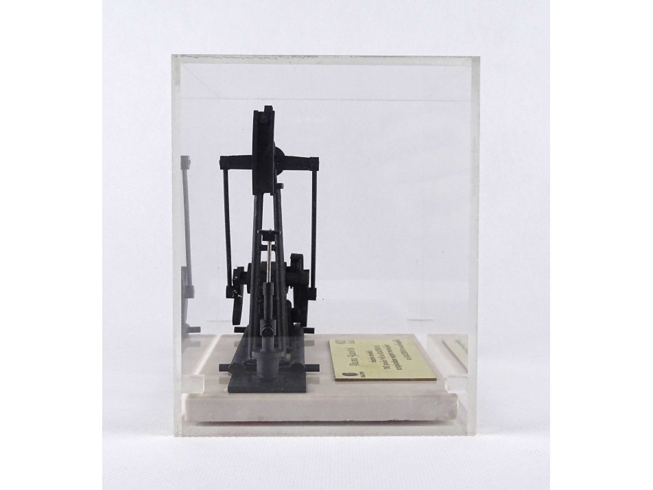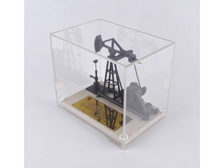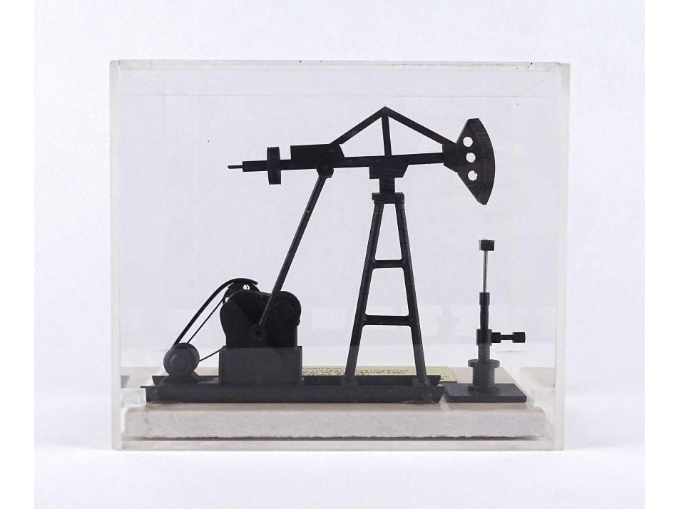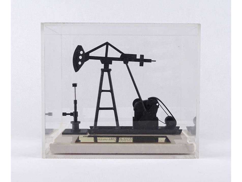 Márvány lapra illesztett, domború műanyag búra alatt található olajkút makett, íróasztal dísz. Előtte táblán felirat, lásd fotó.