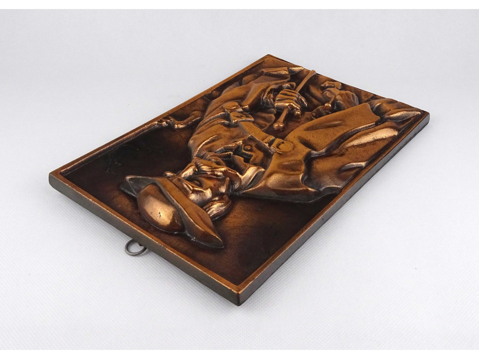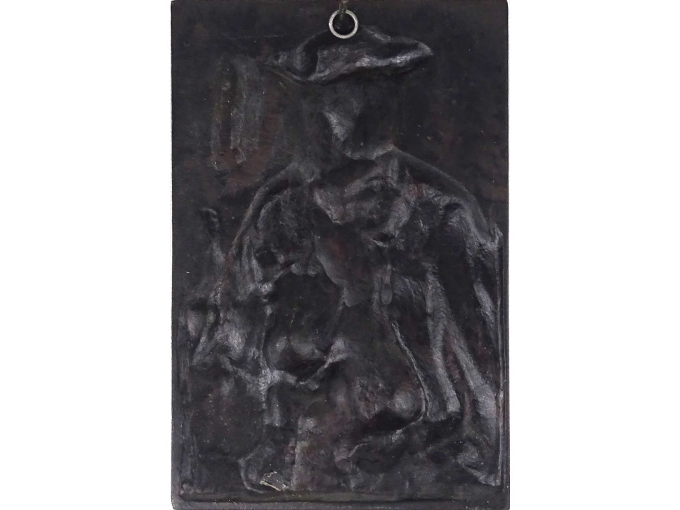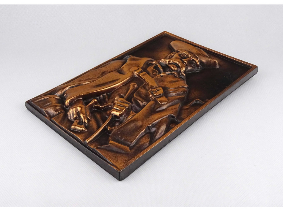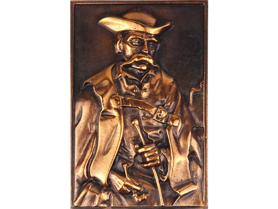 Hibátlan állapotú, öreg csikóst ábrázoló, plasztikus hortobágyi jelenet, nagyméretű, bronzírozott fém fali dísz, fali plakett. Falra akasztási lehetőséggel rendelkezik.
