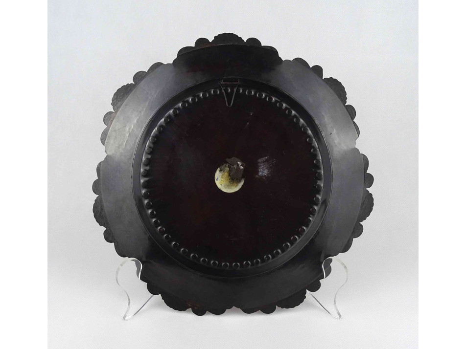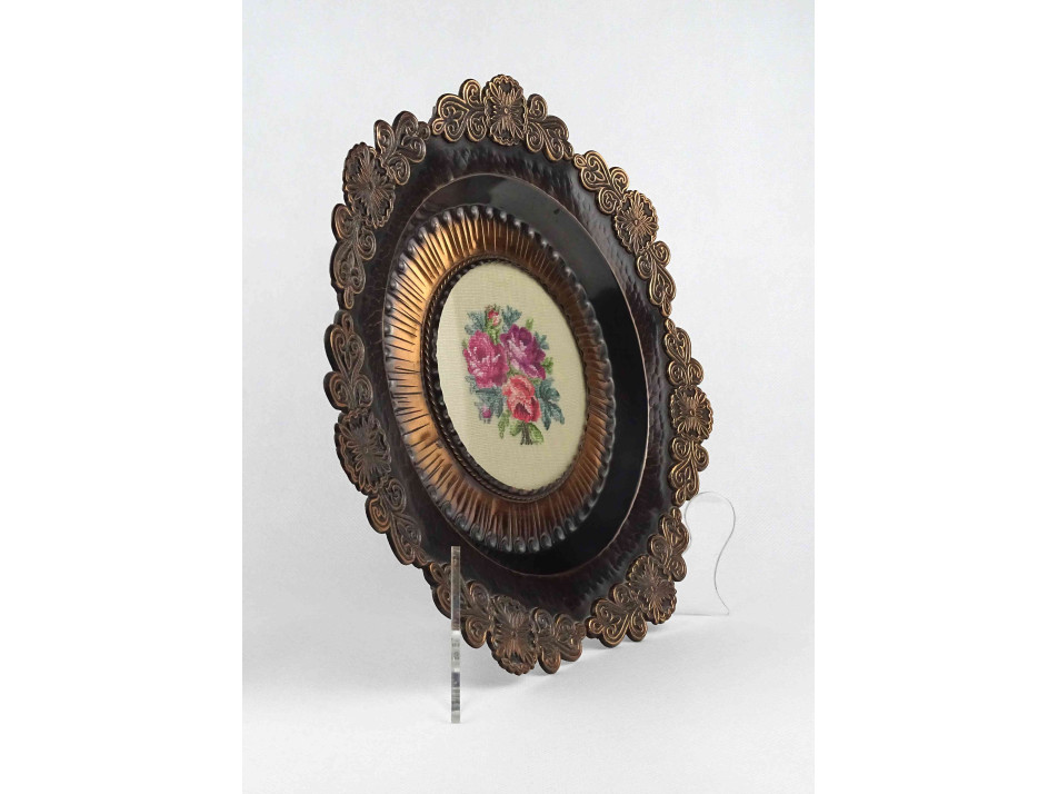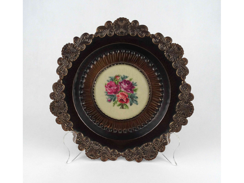 Falra akasztási lehetőséggel rendelkező, réz dísztányér, falitányér. Közepében, üveglap mögött finom hímzés, részletgazdag virágdíszes kézimunka, gobelin.