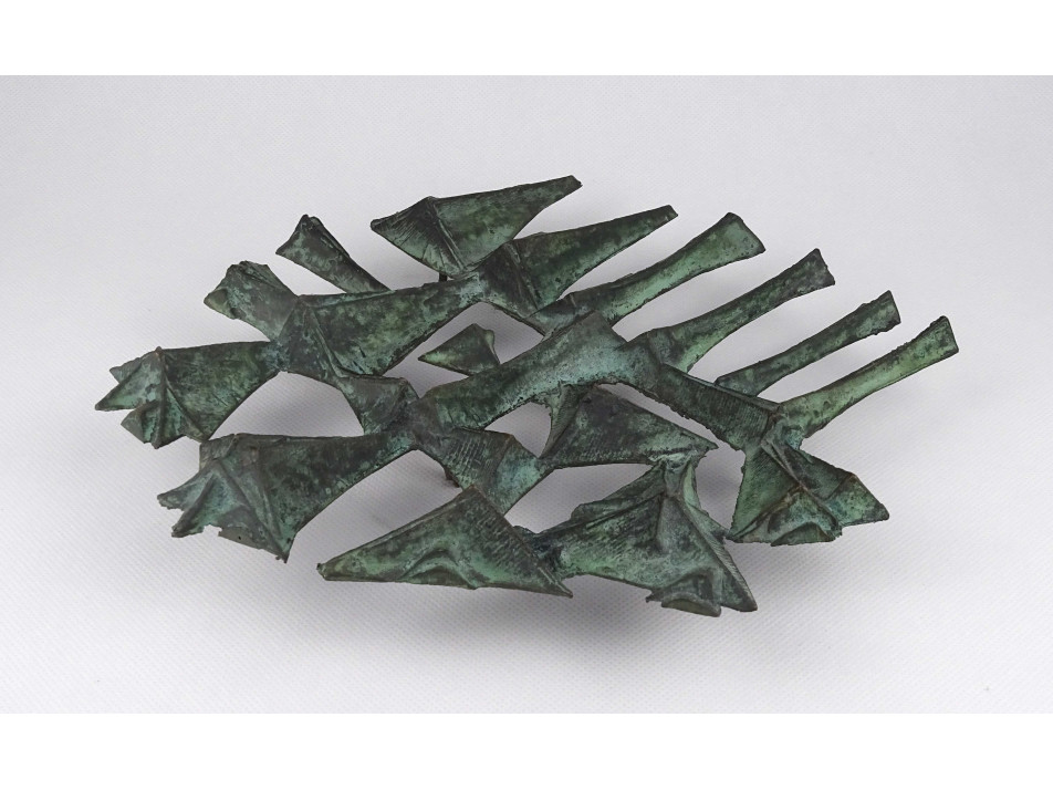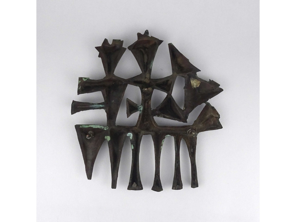 Régi, jelzetlen iparművészeti munka, patináns bronz falidísz, stilizált emberalakokat ábrázoló dombormű.