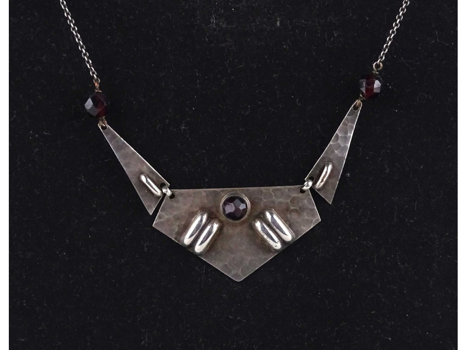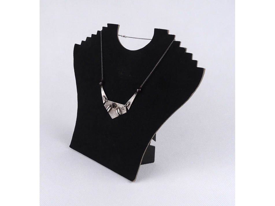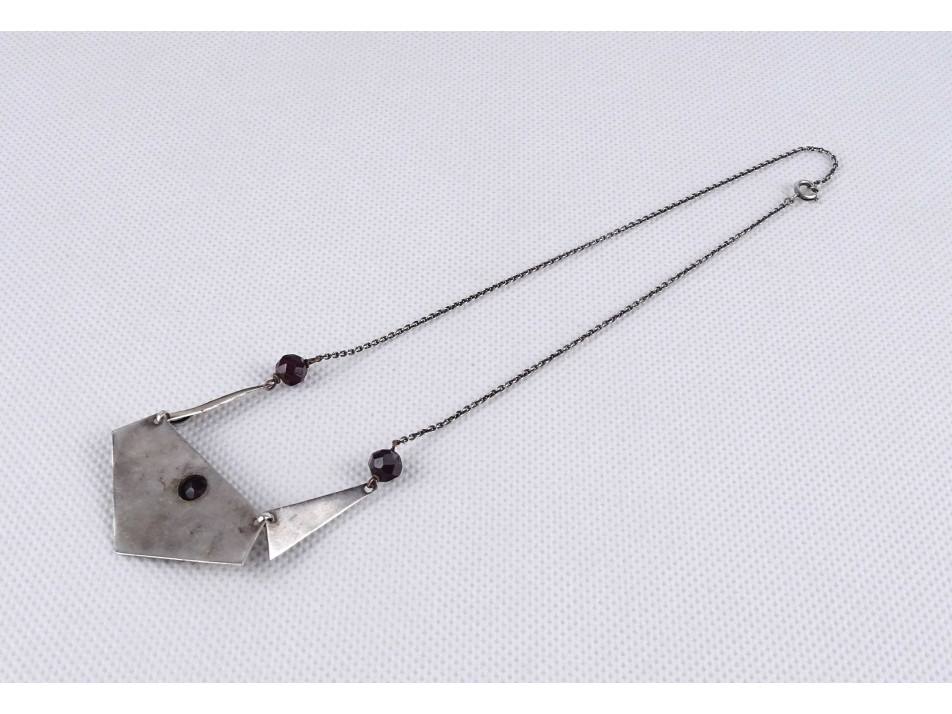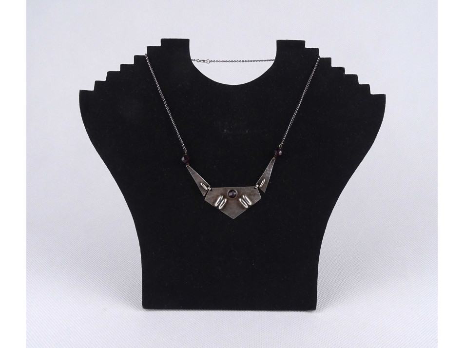 Régi, ezüstözött alpakka nyaklánc, nyakék, kalapált háromszög alakú középrésszel, piros üveg kövekkel díszítve.