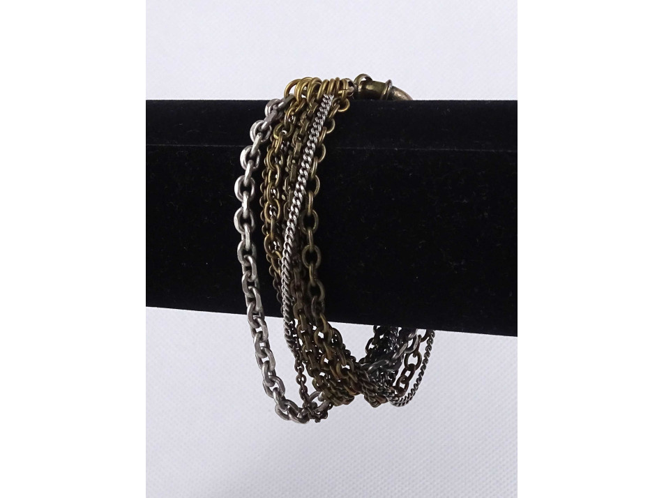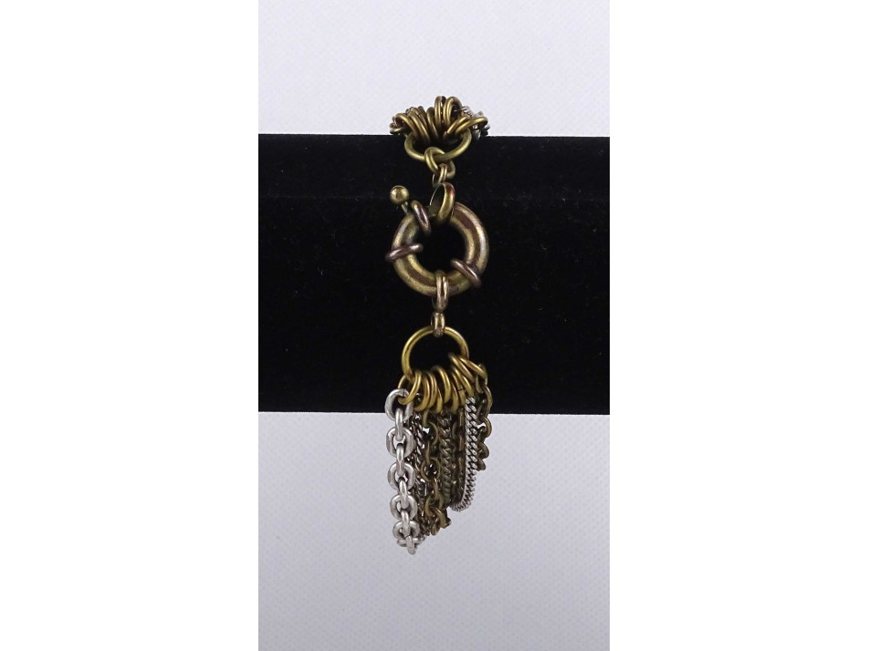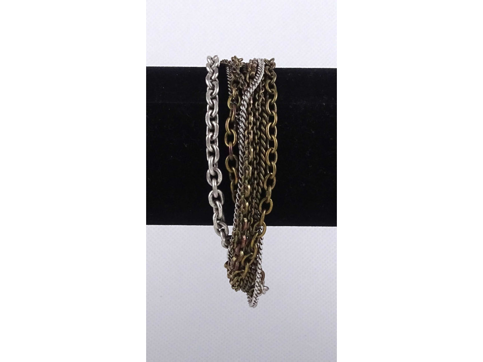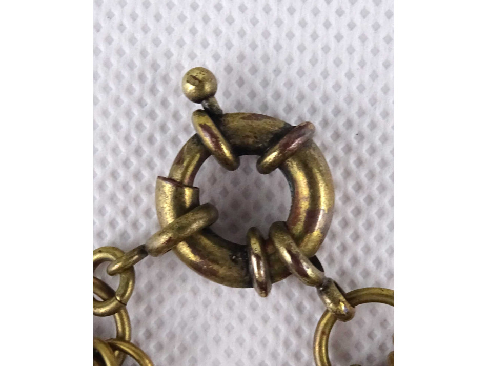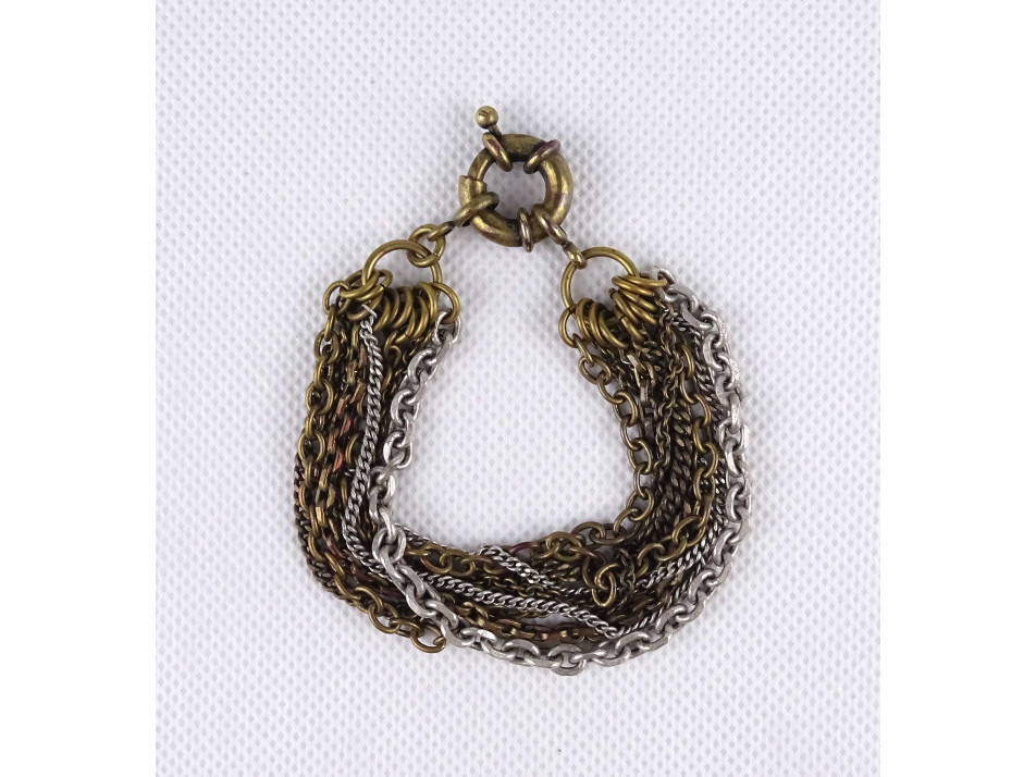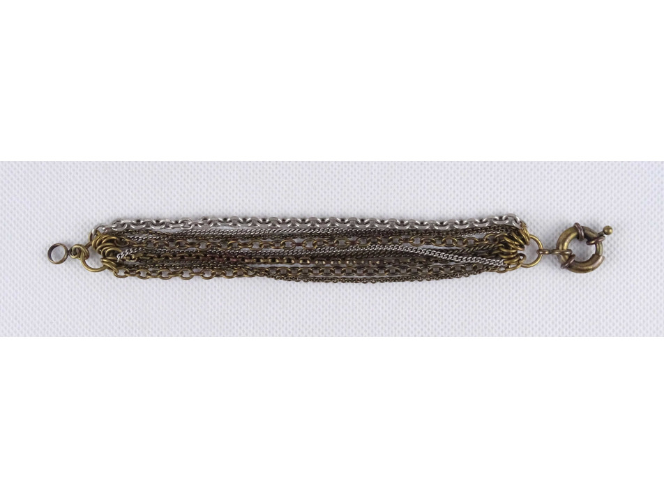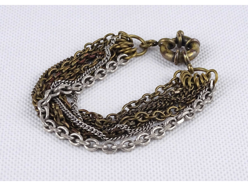 Régi, különleges, 9 soros, különböző színű és fazonú láncokból álló széles réz zsebóra lánc. Nagyméretű, kézi készítésű zárral.