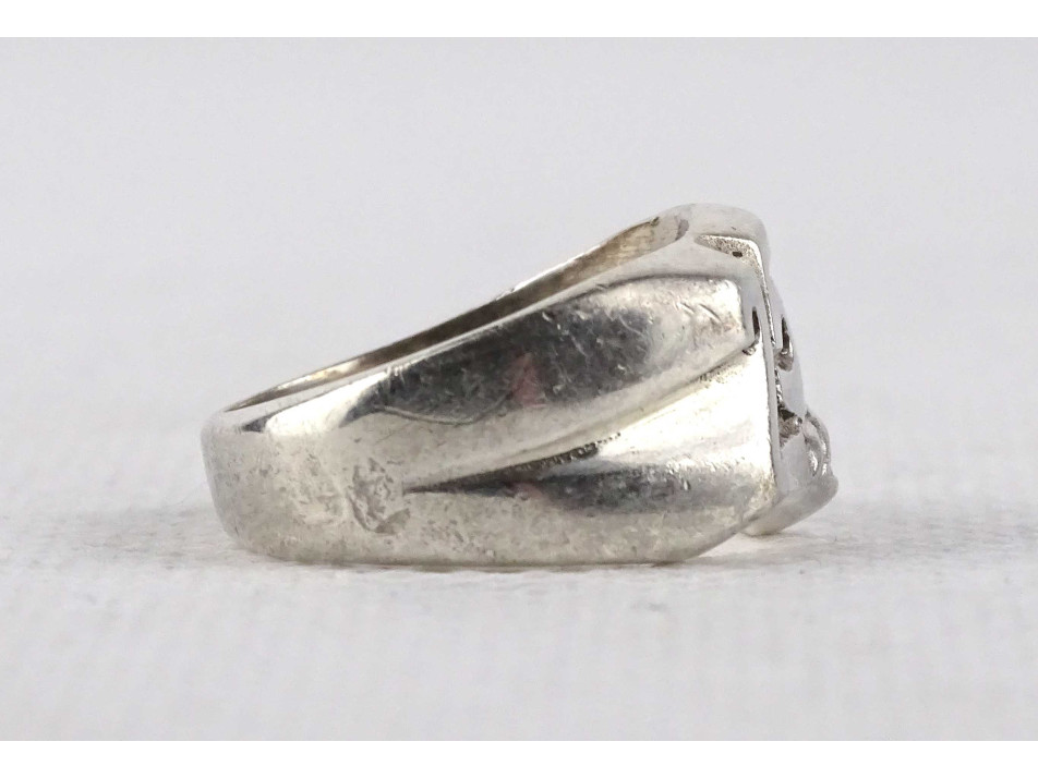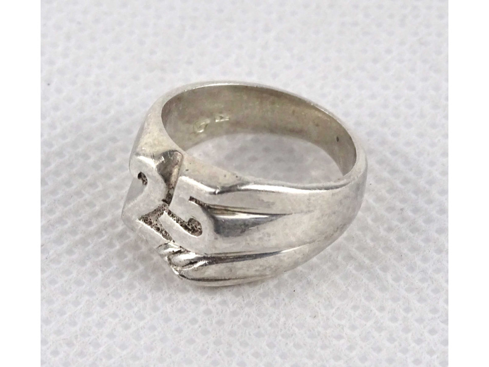 Régi, jelzett, 925-ös finomságú ezüst férfi pecsét gyűrű, 25-ös számjegyet formáló gyűrűfejjel. Benne beütött repülő daru bal oldalán 1-es jelzéssel, ami az 1966-tól használt 925-ös finomságjelzés, mellette "MCS" mesterjel.