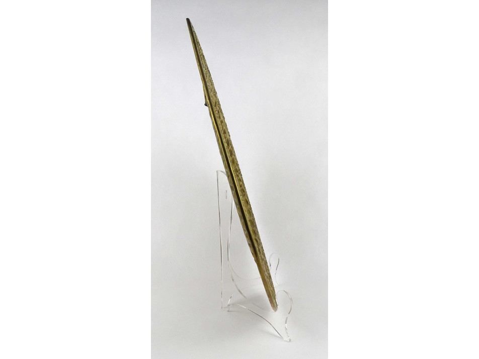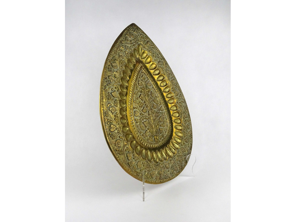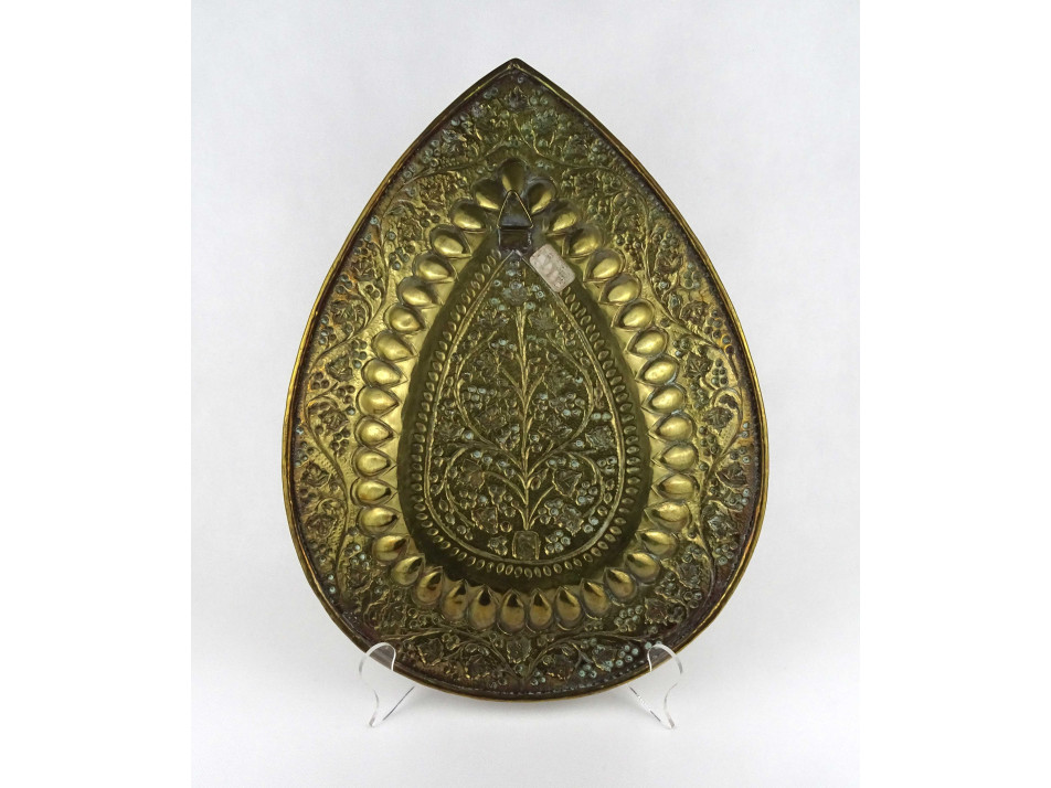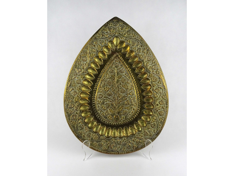 Régi, cizellált, domborított növényi mintákkal gazdagon díszített, csepp alakú, nagyméretű, keleti, perzsa vagy indiai réz kínáló tálca, falitál, falidísz. Hátoldalán akasztási lehetőseggel rendelkezik.