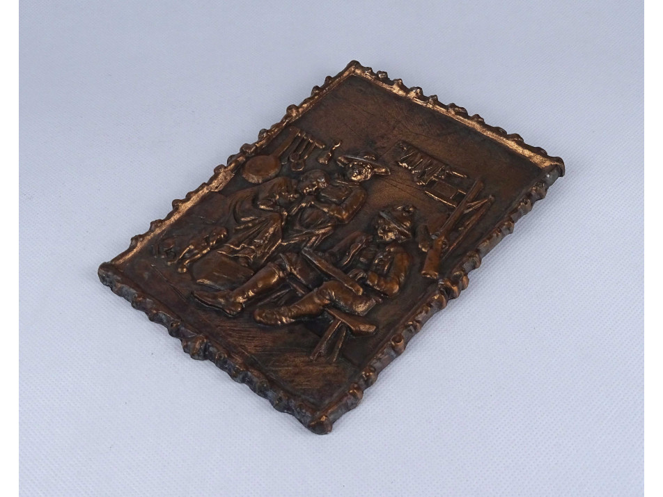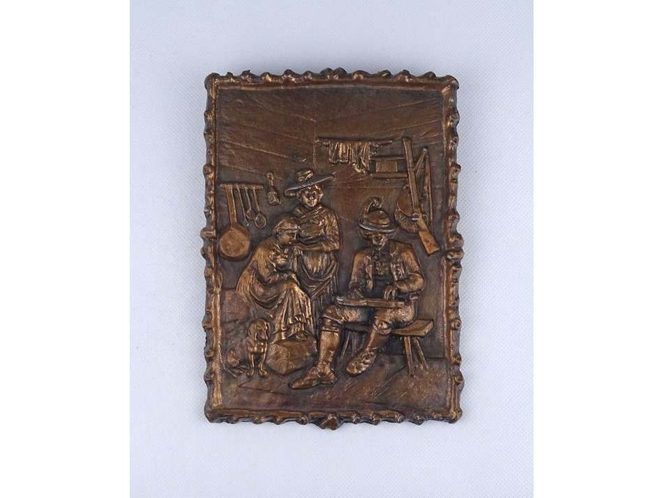 Régi, szép állapotú, citerázó tiroli vadászt ábrázoló, plasztikus kocsma jelenet, nagyméretű, bronzírozott fém doborműves fali dísz, fali plakett. Falra akasztási lehetőséggel rendelkezik.
