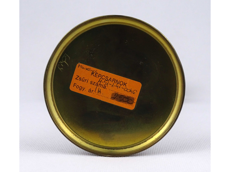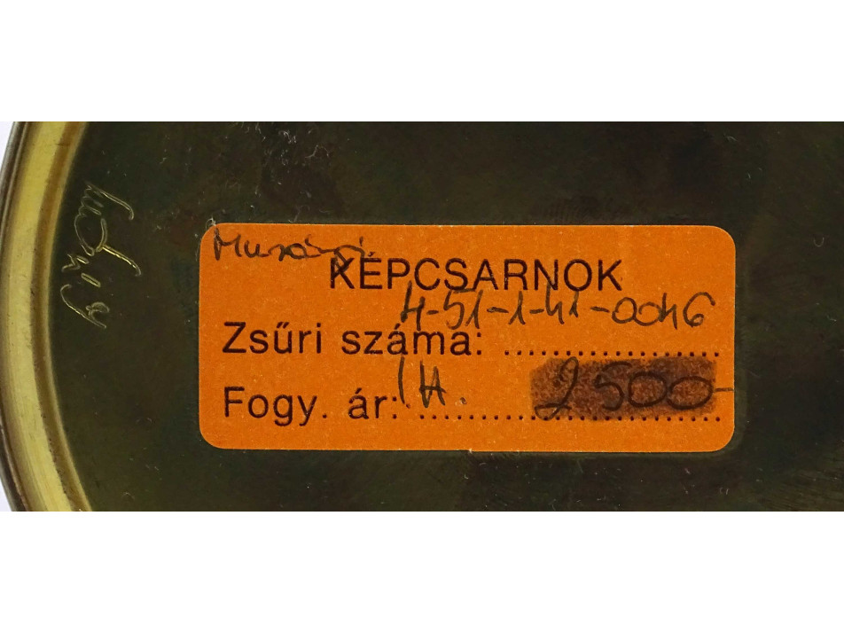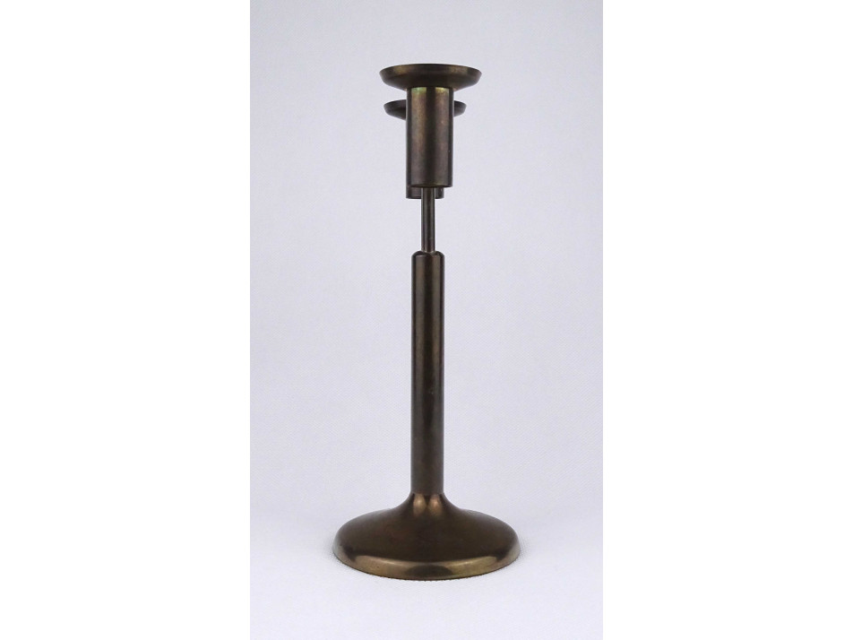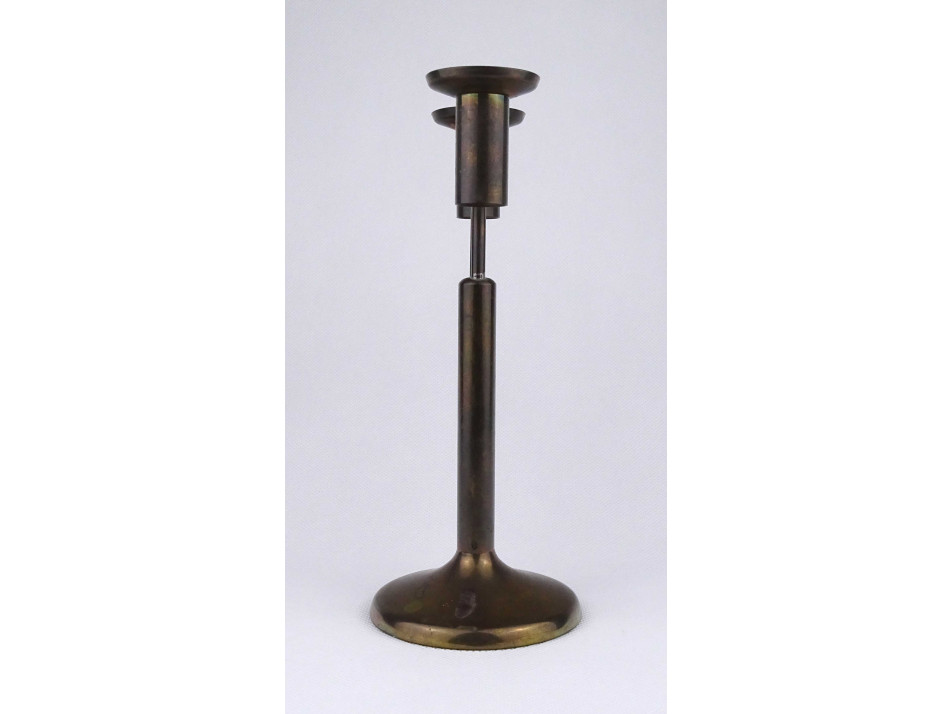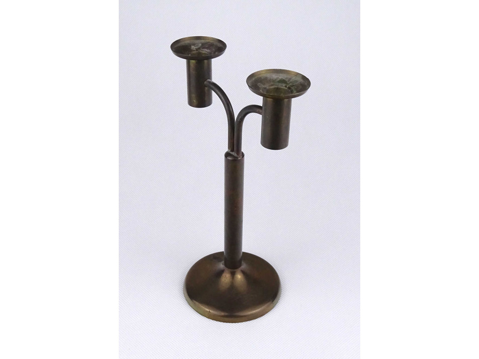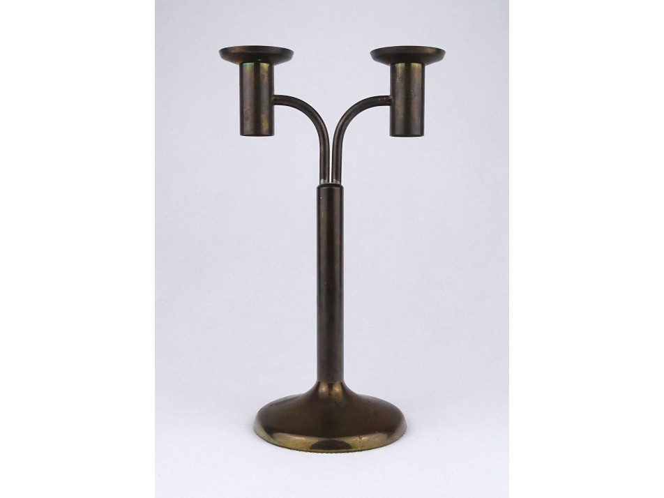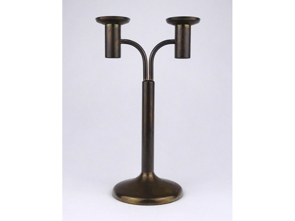 Retro képcsarnokos art deco stílusú, kétkaros, réz asztali gyertyatartó, design tárgy. Alján képcsarnokos címke, mellette vésett jelzés, lásd fotó.