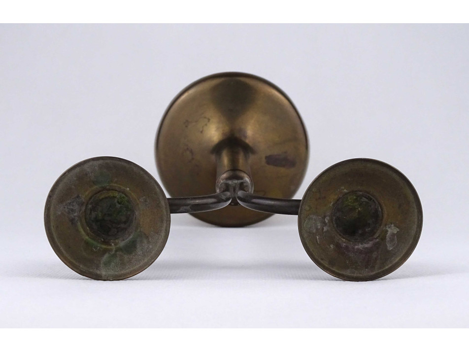 Retro képcsarnokos, jelzett, art deco stílusú, két ágú, réz asztali gyertyatartó 21.7 cm