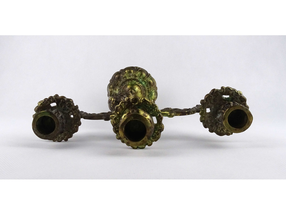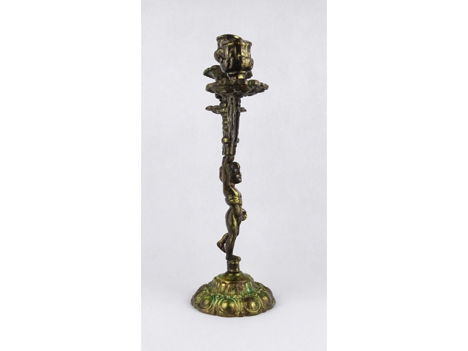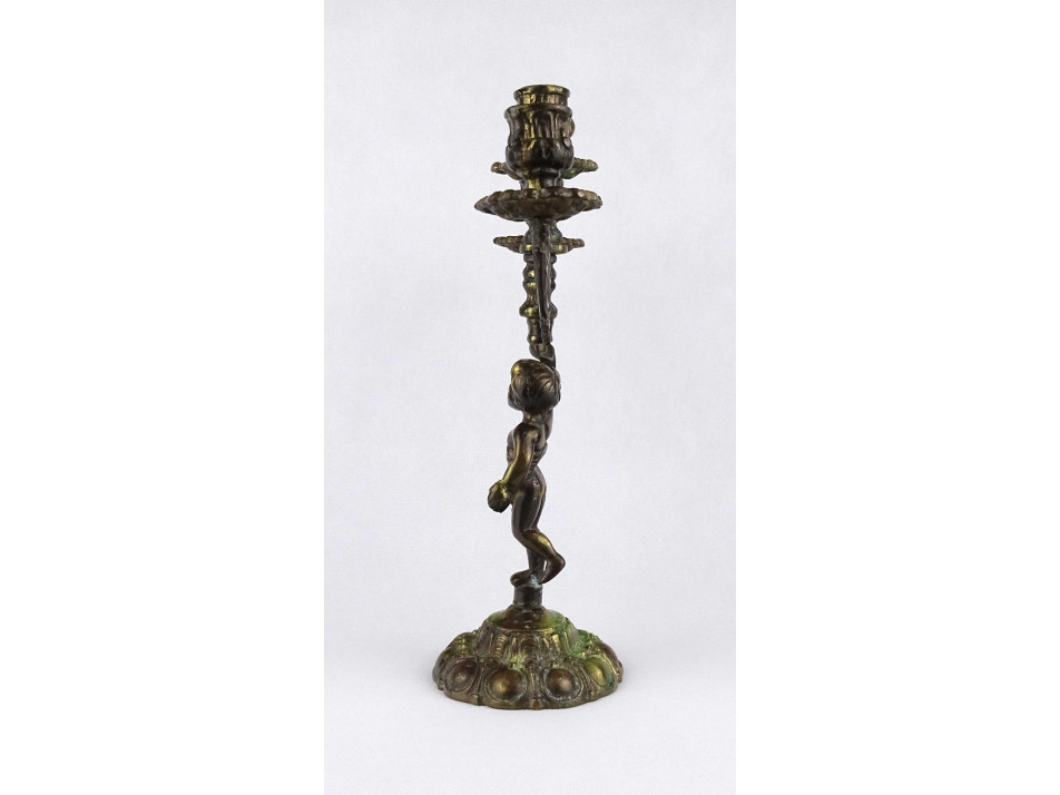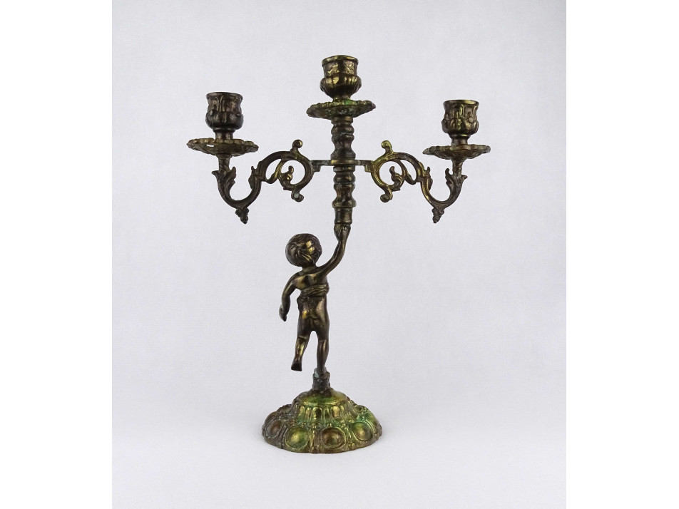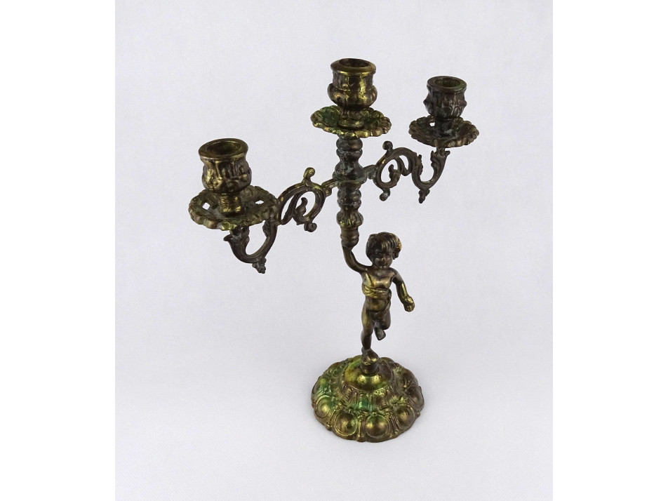Régi, szép állapotú, nagyméretű, díszes, három állásos, réz gyertyatartó. Teste egy puttót vagy angyalt formáz, amely a gyertyákat tartja. A gyertyatartó menetes, darabokra szedhető.
