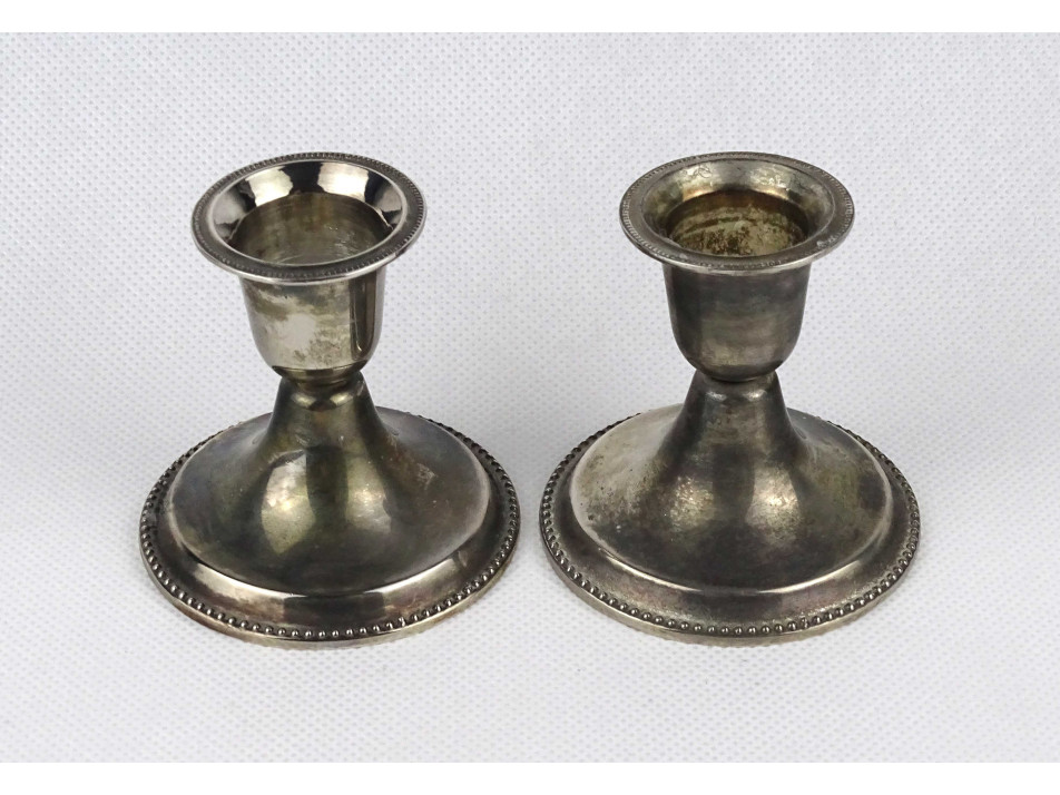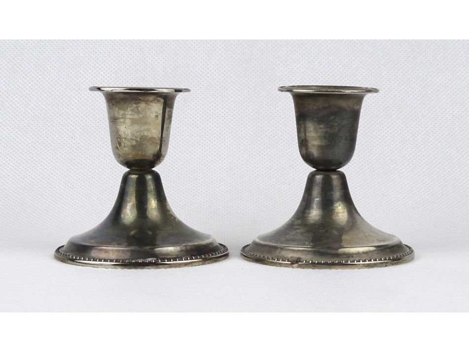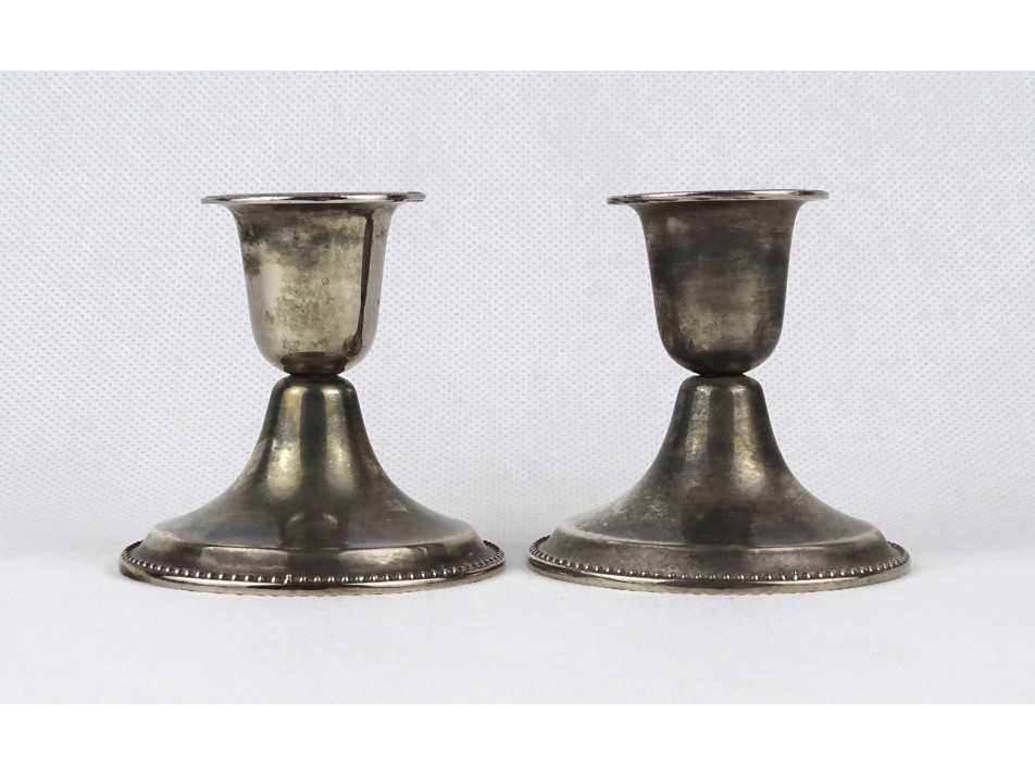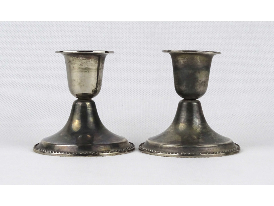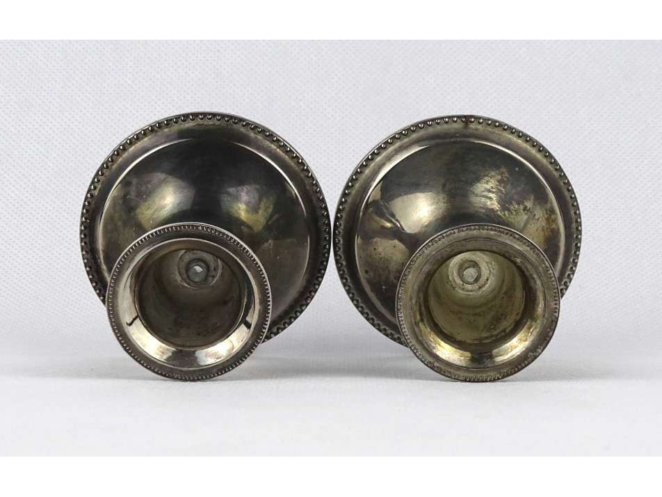 Régi, egyszerű vonalvezetésű, alacsony, talpas, ezüstözött fém gyertyatartó pár. Ezüstözésük hibátlan, kopásmentes.