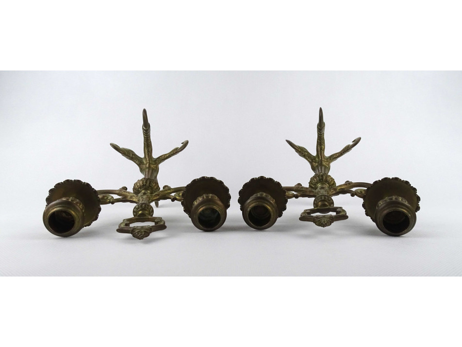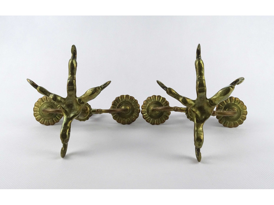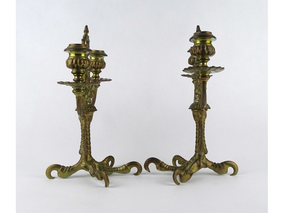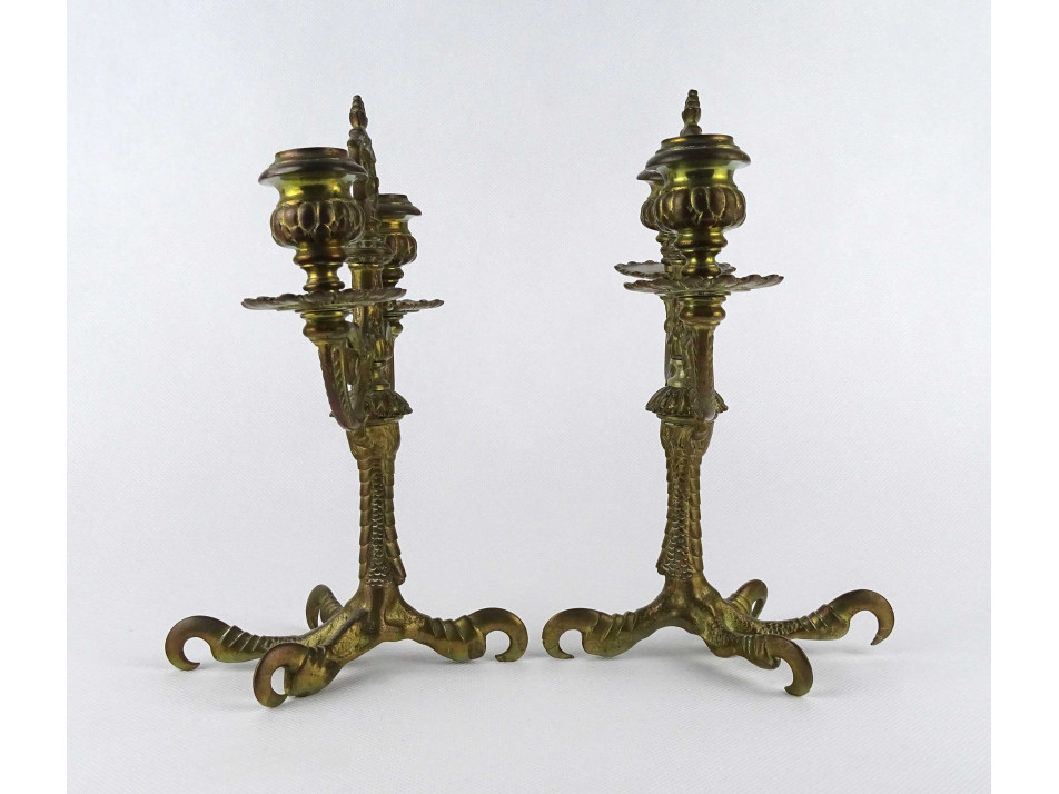 Régi, szép állapotú, részletes kidolgozású, plasztikus saslábat formázó, talapzaton álló, kétkaros réz gyertyatartó pár.