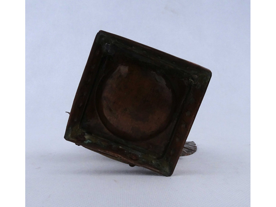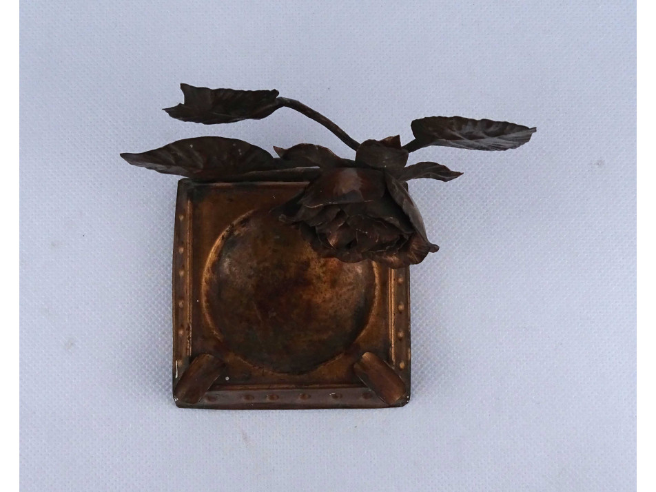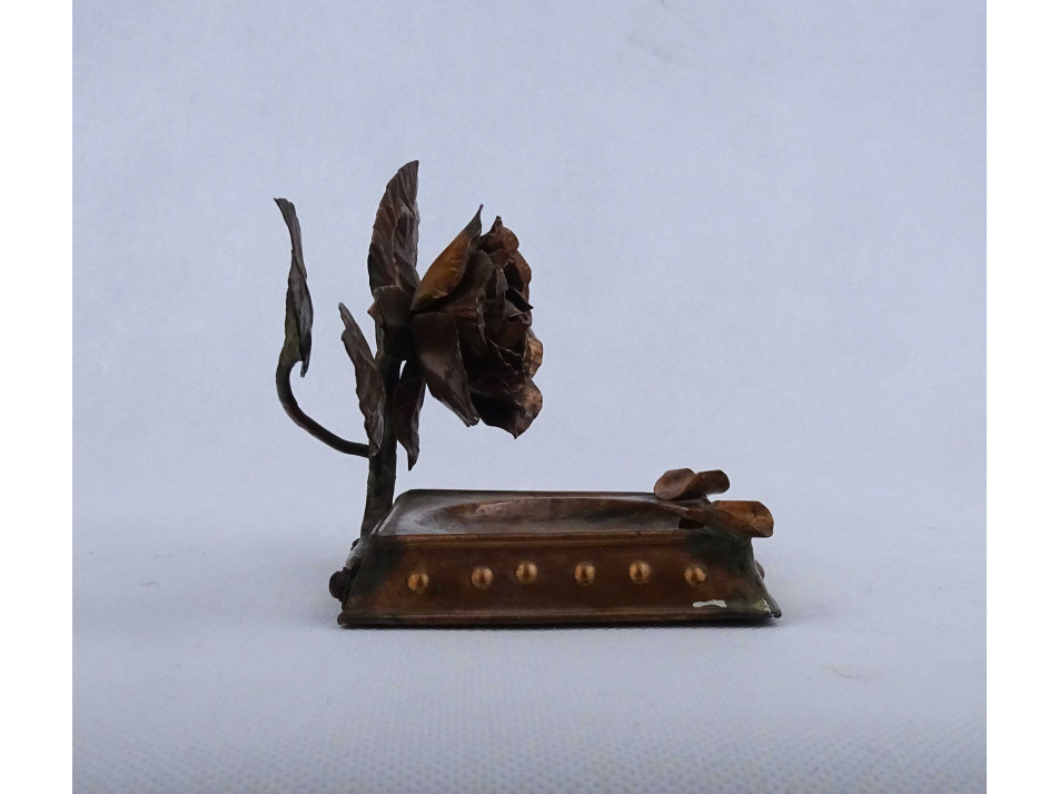 Kézimunkával készült, kalapált, domborított mintákkal és egy nagymértű plasztikus rózsával díszített kétállásos, réz hamutál. A rózsa egyik levele mozog.