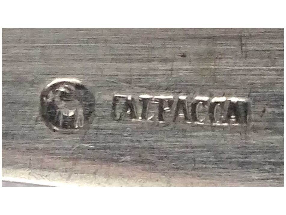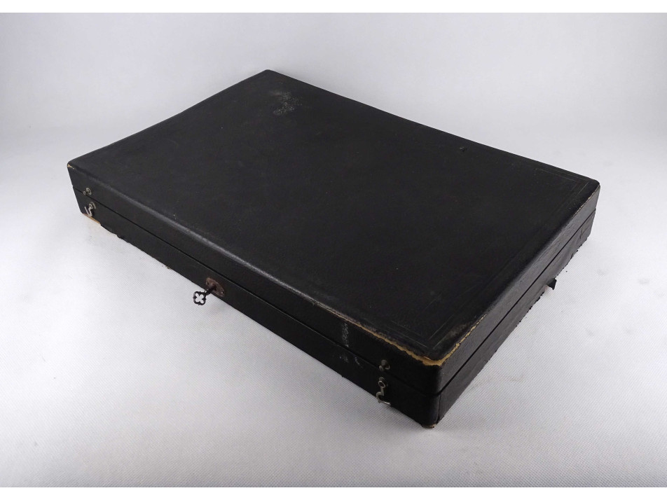 Régi, szép állapotú, ezüstözött alpakka evőeszköz készlet eredeti dobozában. A doboz viseltes, de javítható állapotú. A kések pengéi enyhén rozsdásak, korrodáltak.