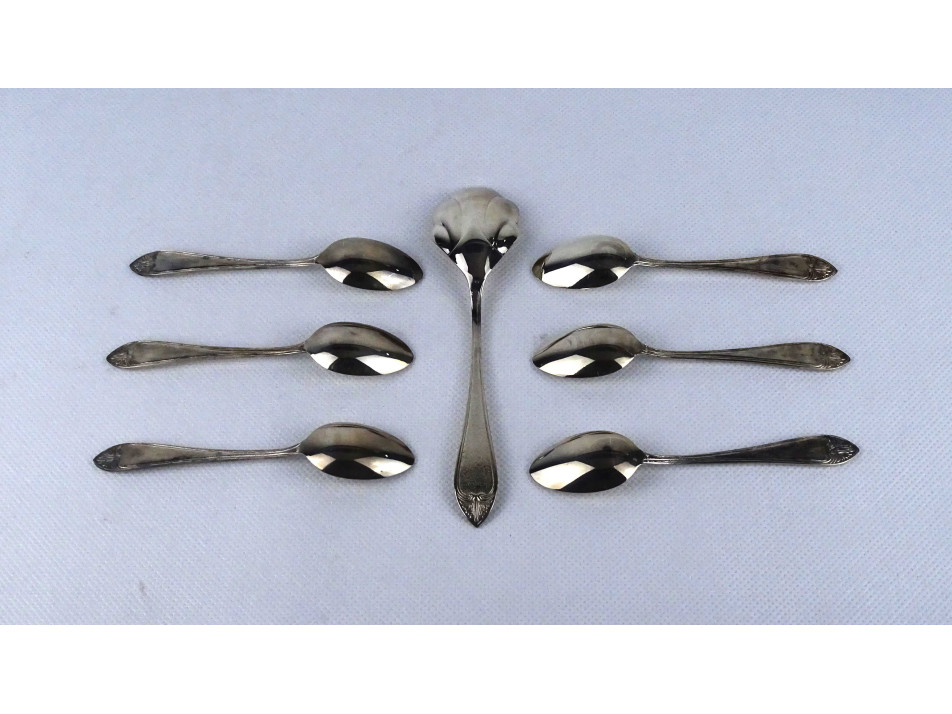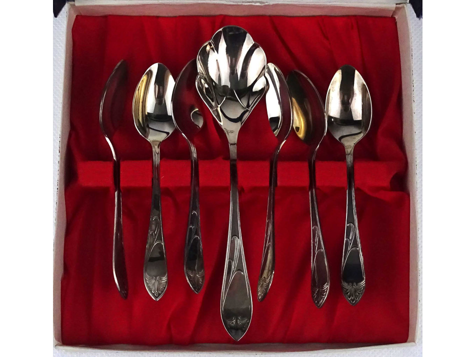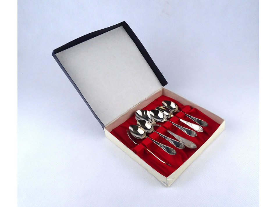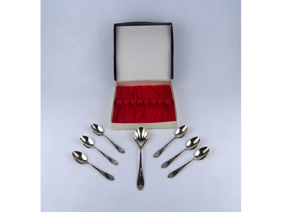 Régi vastagon ezüstözött METZ kiskanál evőeszköz készlet díszdobozban 7 darab