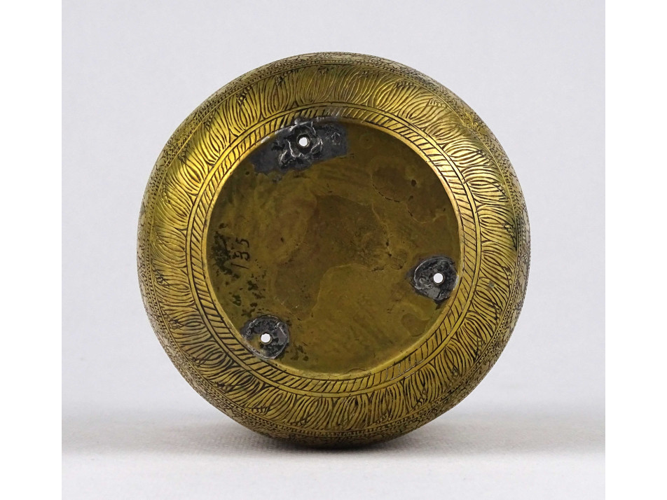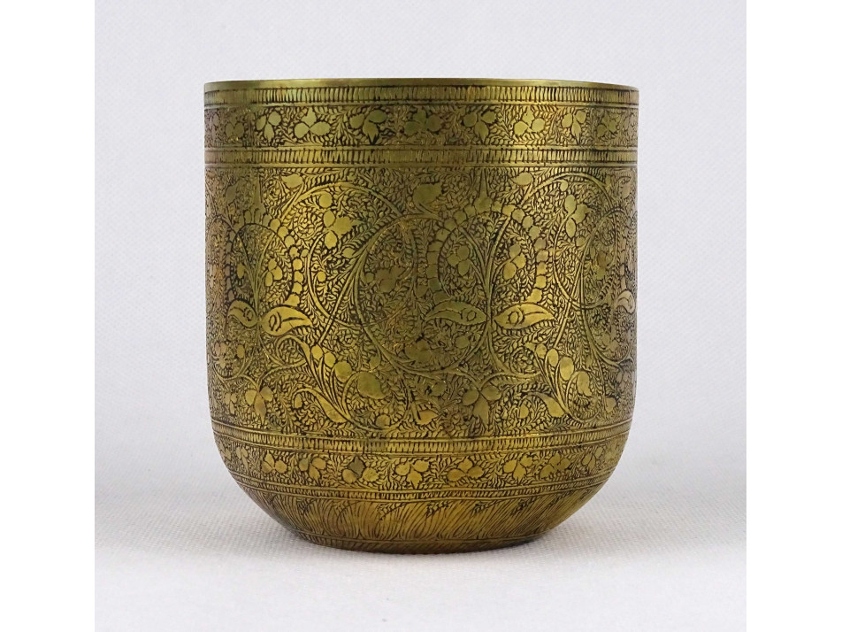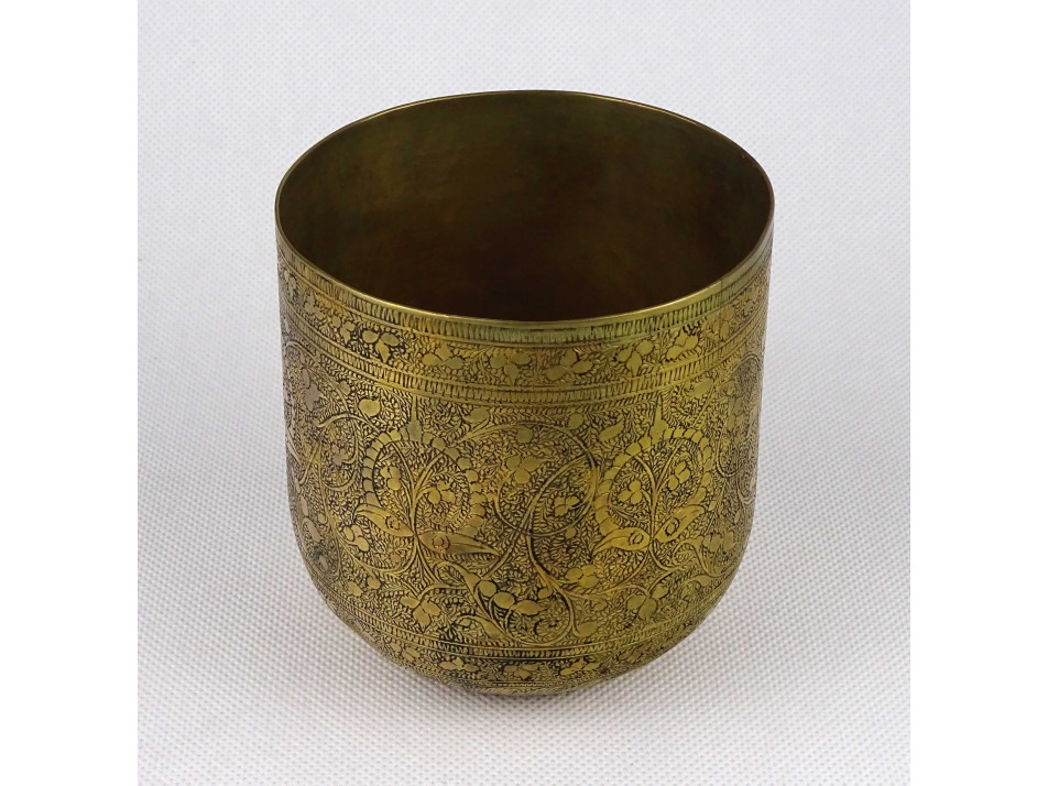 Főoldal » Fémműves termékek » Kaspó » Régi, keleti, indiai, vésett mintákkal díszített, réz kaspó, virágtartó 10.3 x 9.7 cm
