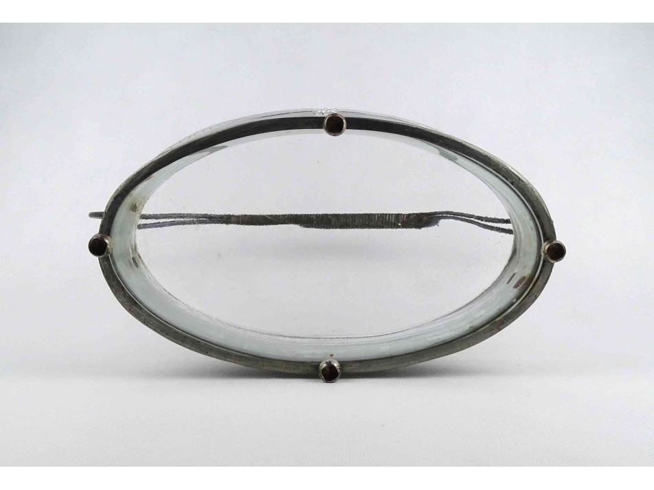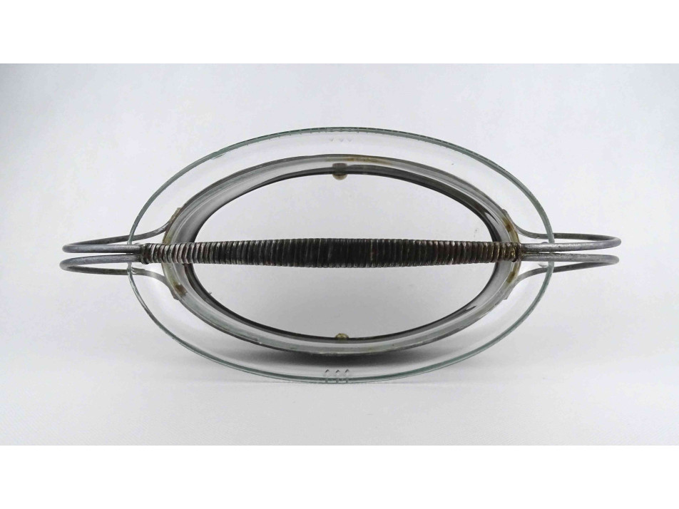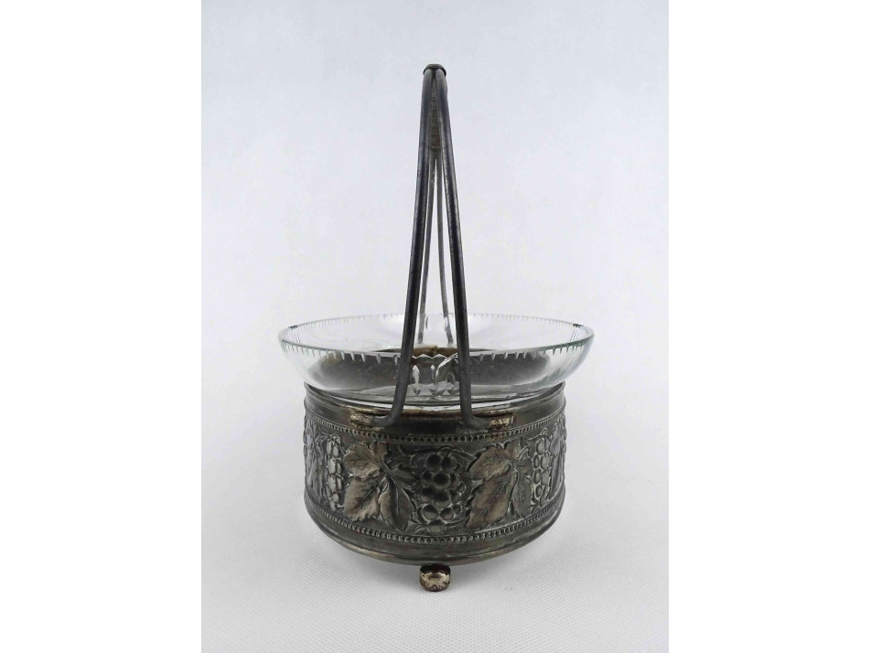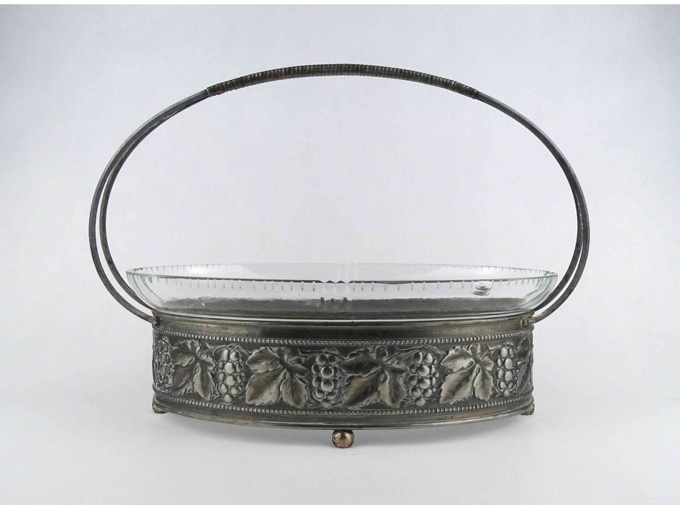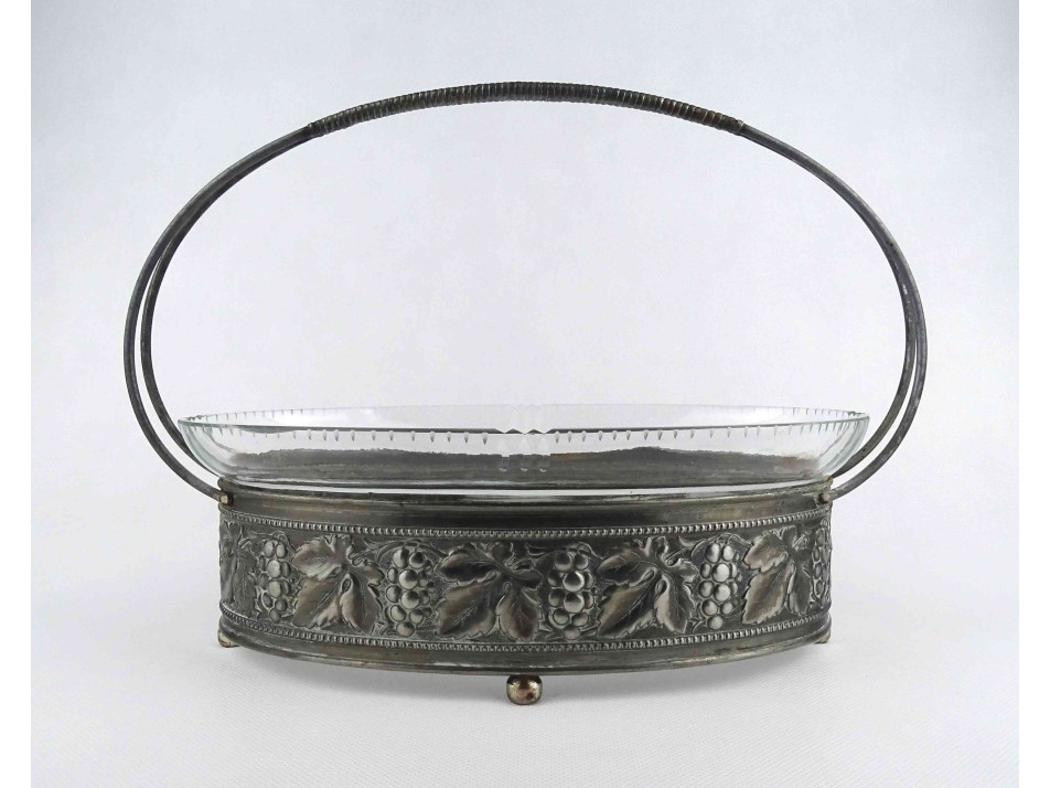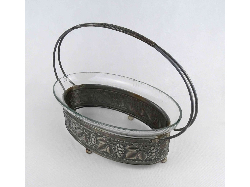Régi, jelzetlen, ovális alakú, szőlőlevél és szőlőfürt mintákkal díszített fém keretes, lábakon álló csiszolt üvegbetétes asztalközép kínáló, gyümölcskínáló, gyümölcskosár. Az üvegbetéten két kisebb lepattanás látható.