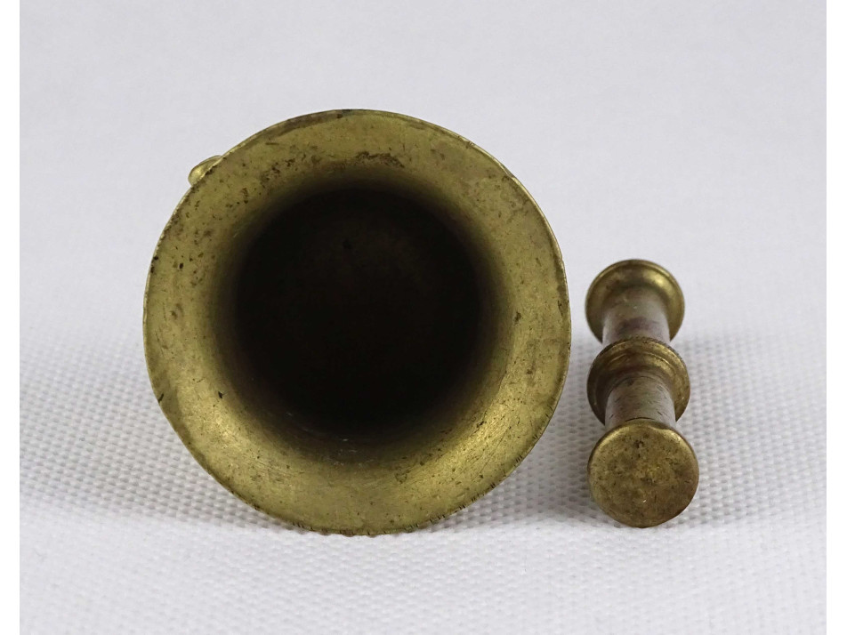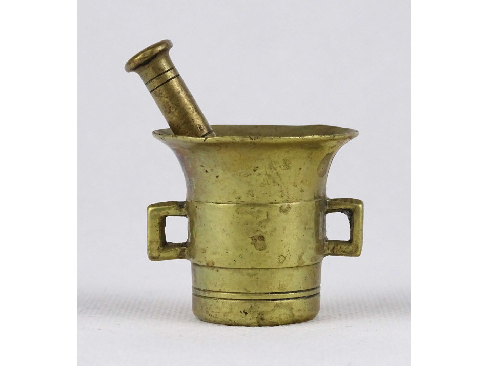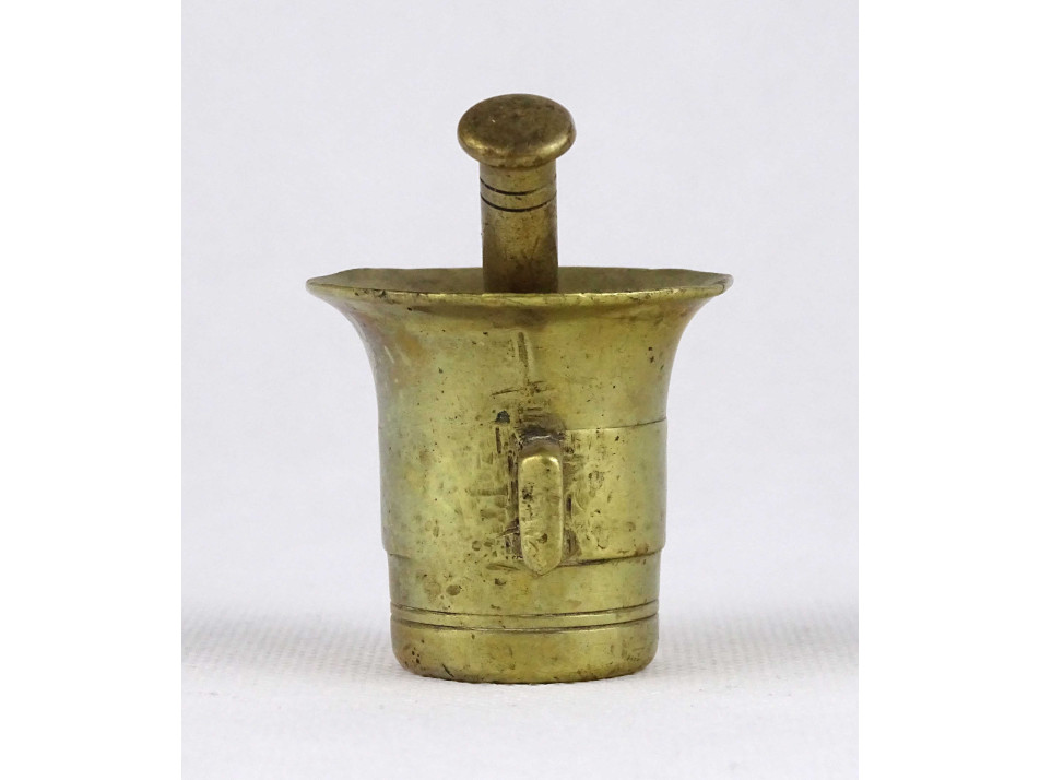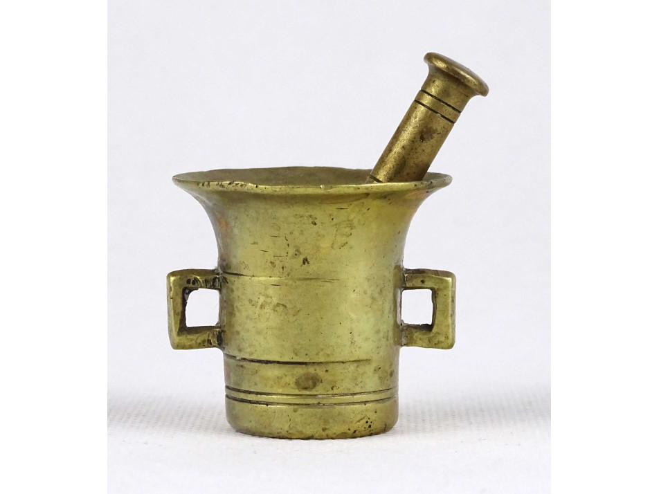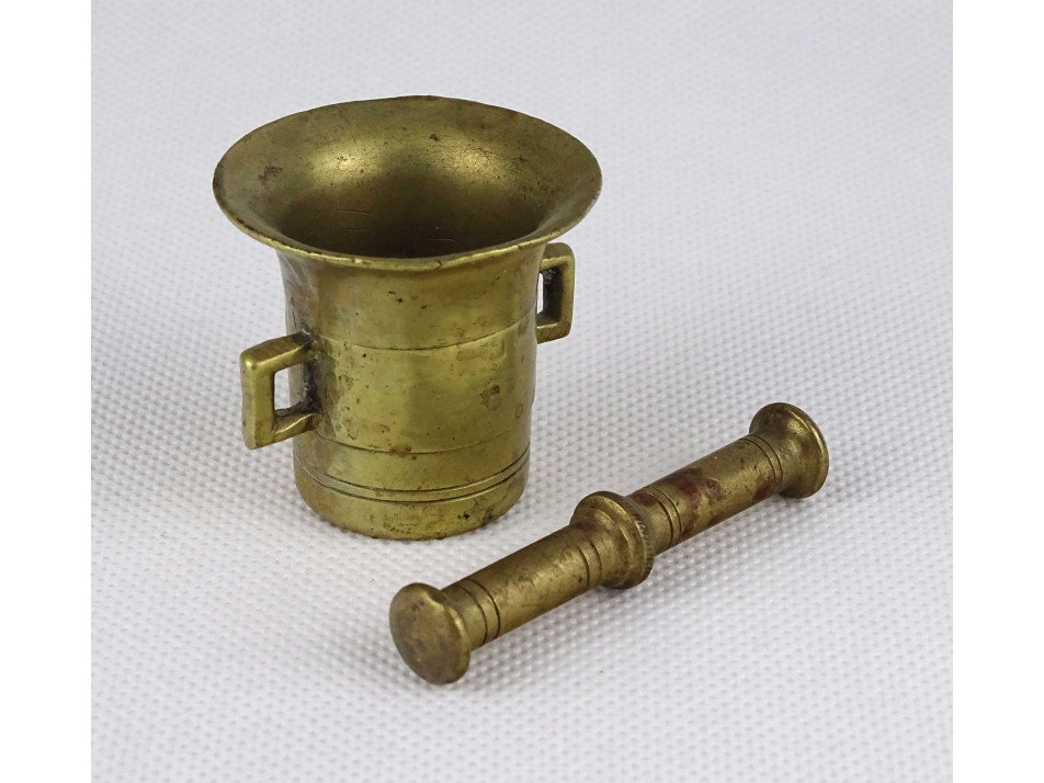 Régi, kisméretű, szép állapotú, szögletes fülű réz mozsár, eredeti törőjével.
