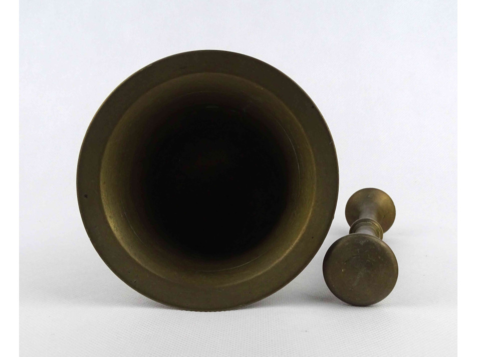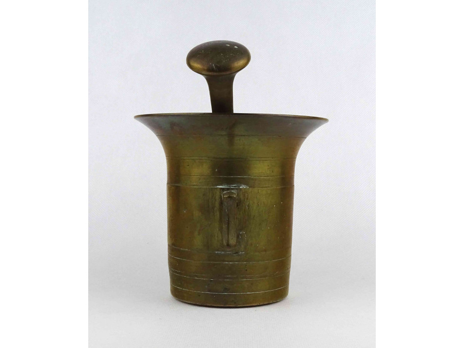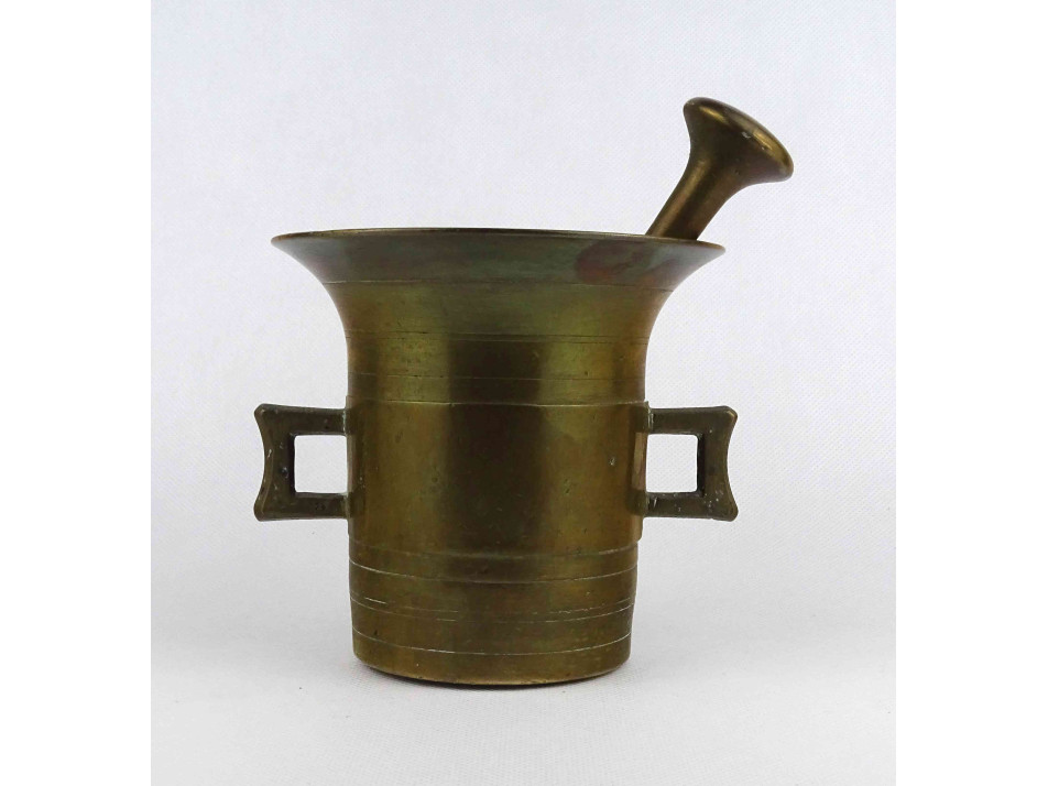 Antik, patinás szögletes fülű réz mozsár törővel.