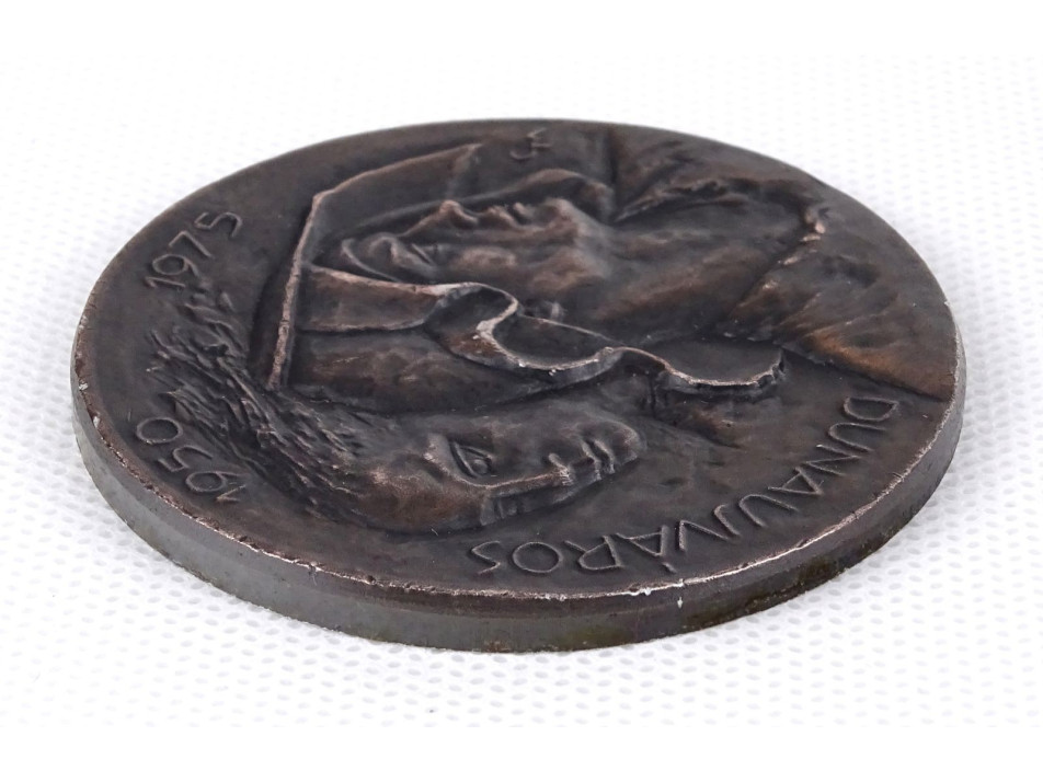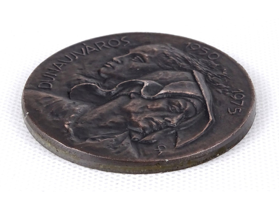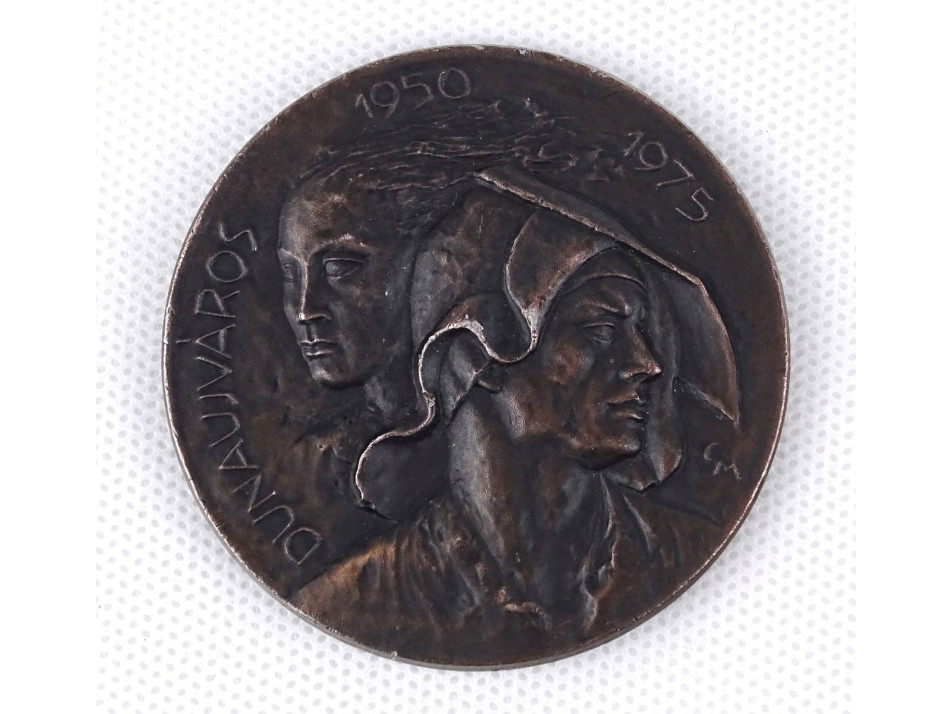 Kis méretű bronzzal futtatott fém plakett, emlékplakett. Hátoldala kopottas. Jelzés: CM Felirat: DUNAÚJVÁROS 1950-1975