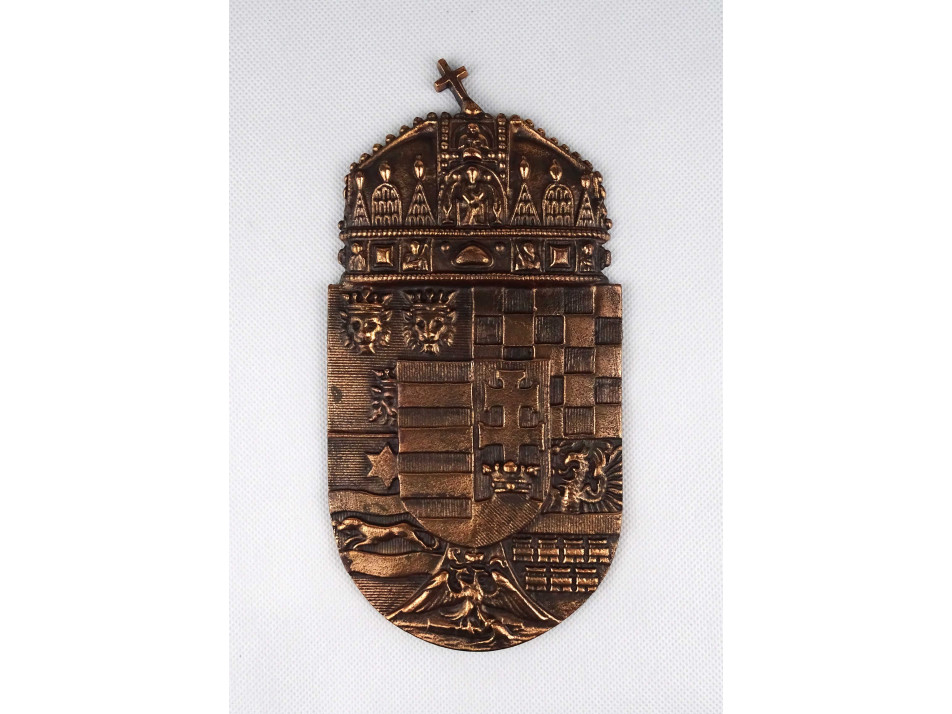 Szép állapotú, nagy méretű, régi, történelmi, koronás magyar címer, bronzírozott fém plakett, falidísz.