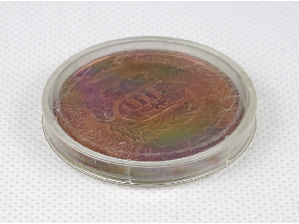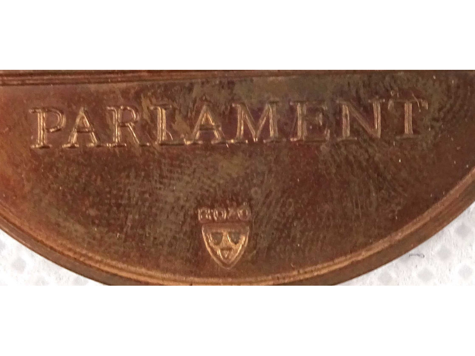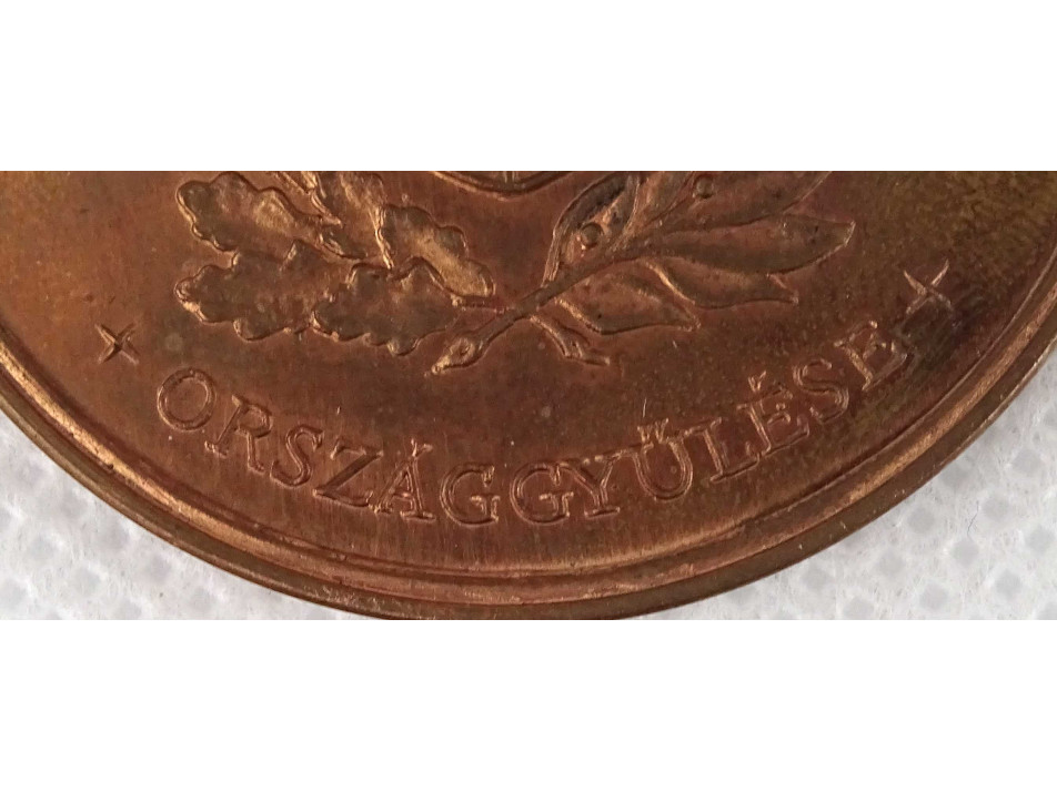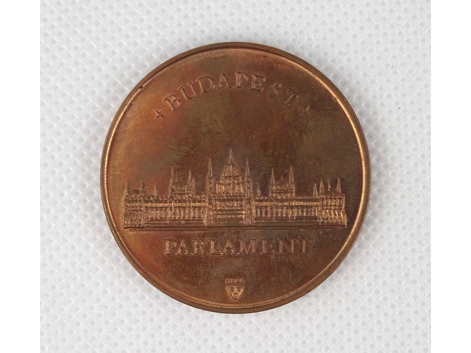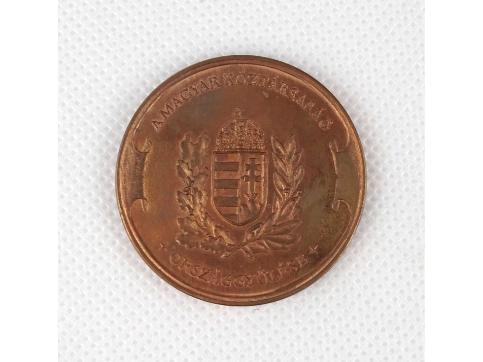Műanyag tokjában található, kétoldalas, kis méretű bronzplakett. Egyik oldalona Parlament látképe és felirat: BUDAPEST PARLAMENT Másik oldalon a Magyar Köztársaság címere és felirat: A MAGYAR KÖZTÁRSASÁG ORSZÁGGYŰLÉSE