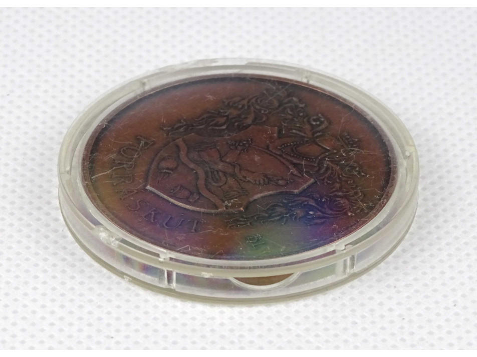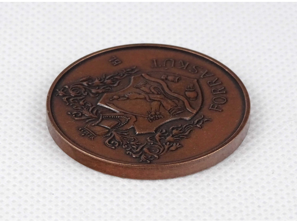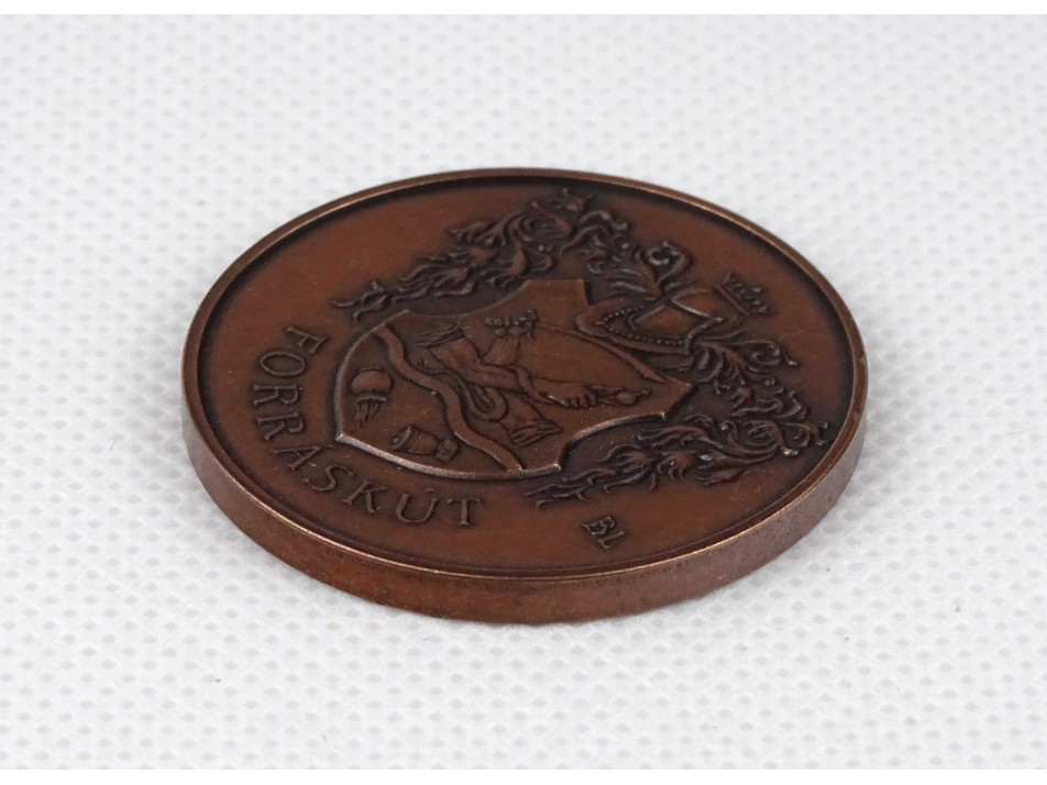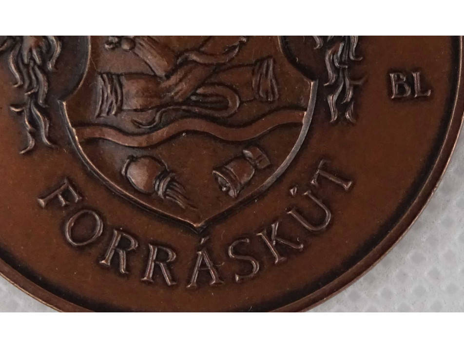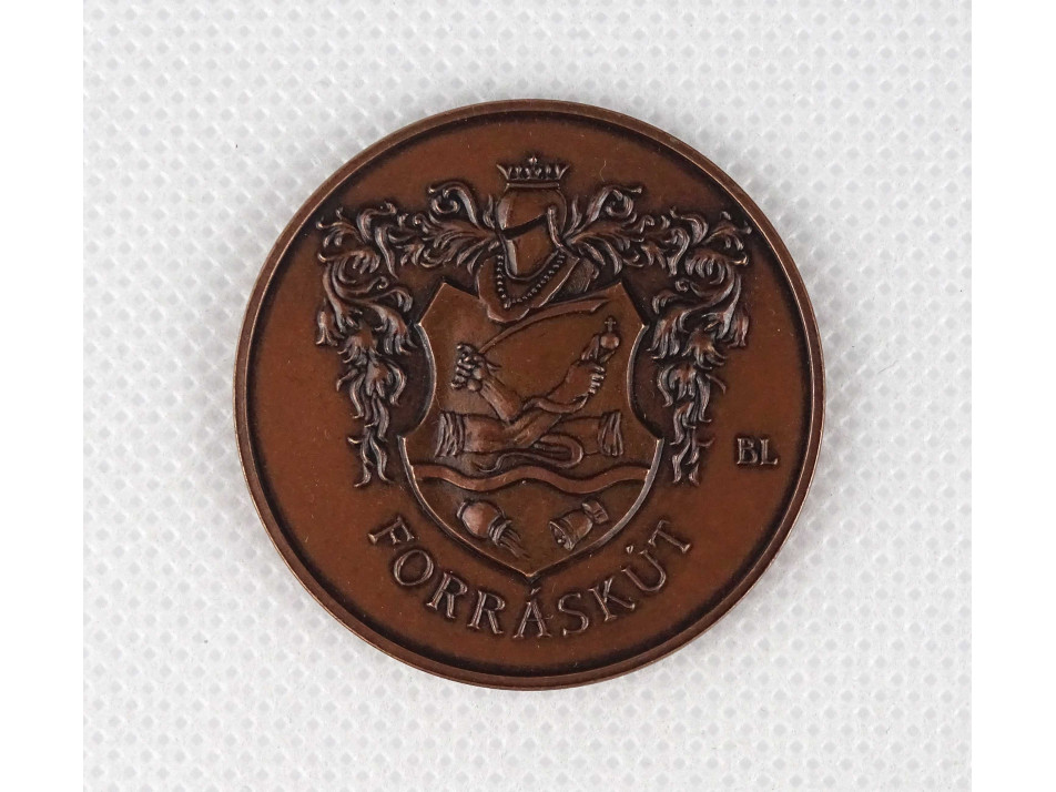 Régi, jelzett, műanyag tokjában található, egyoldalas bronz plakett, emlék érme. Rajta a FORRÁSKÚT felirat és a település címere látható. Jelezve jobbra középen: BL