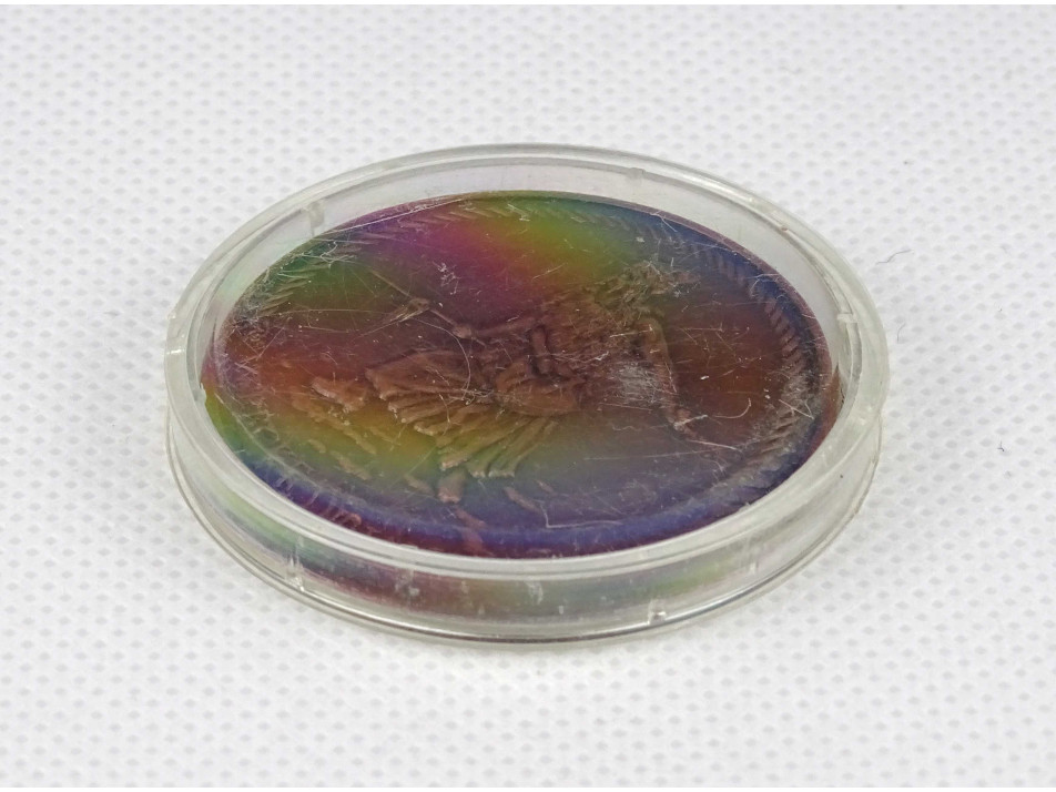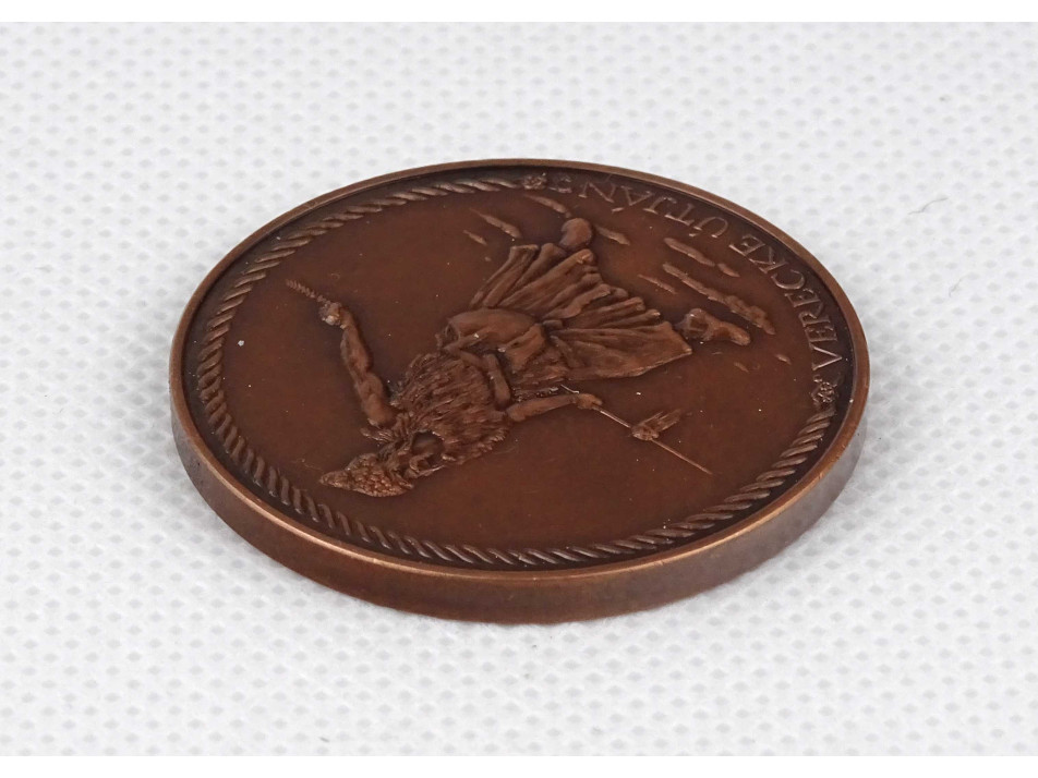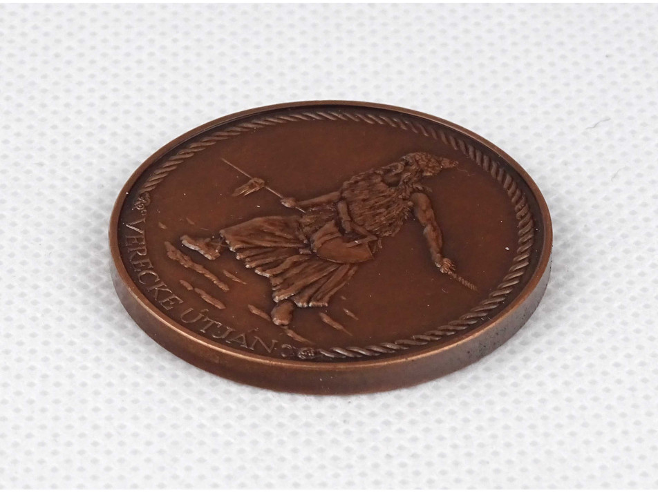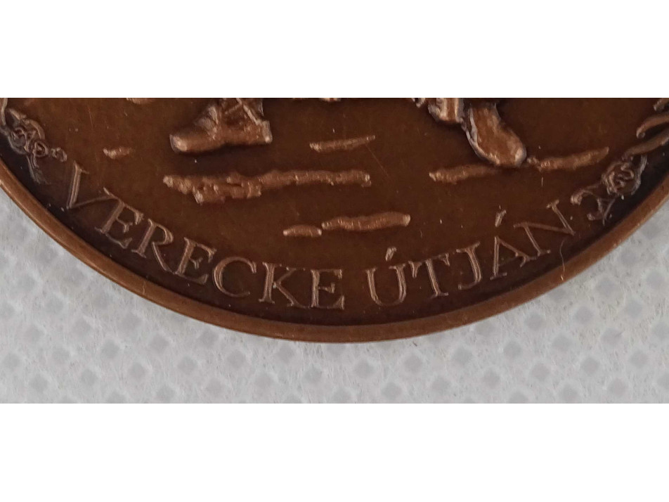 Műanyag tokjában található, egyoldalas, kis méretű bronzplakett. Rajta egy a Feszty körképről ismert alak, alatta felirat: VERECKE ÚTJÁN